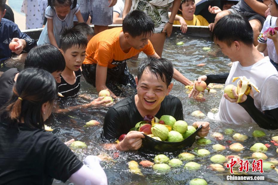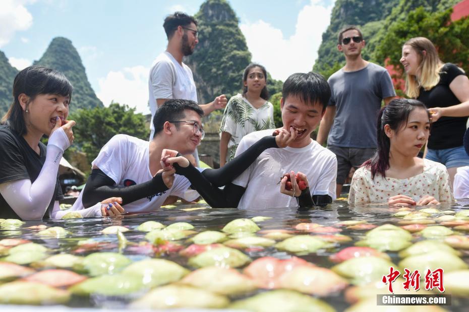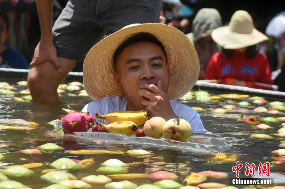 7月25日,广西桂林千古情种植的水果大丰收,工作人员将水果放入巨型冰桶内冰镇,邀请众多游人走入冰桶中享用美味的水果,用这样的方式消暑降温。 陈飞 摄