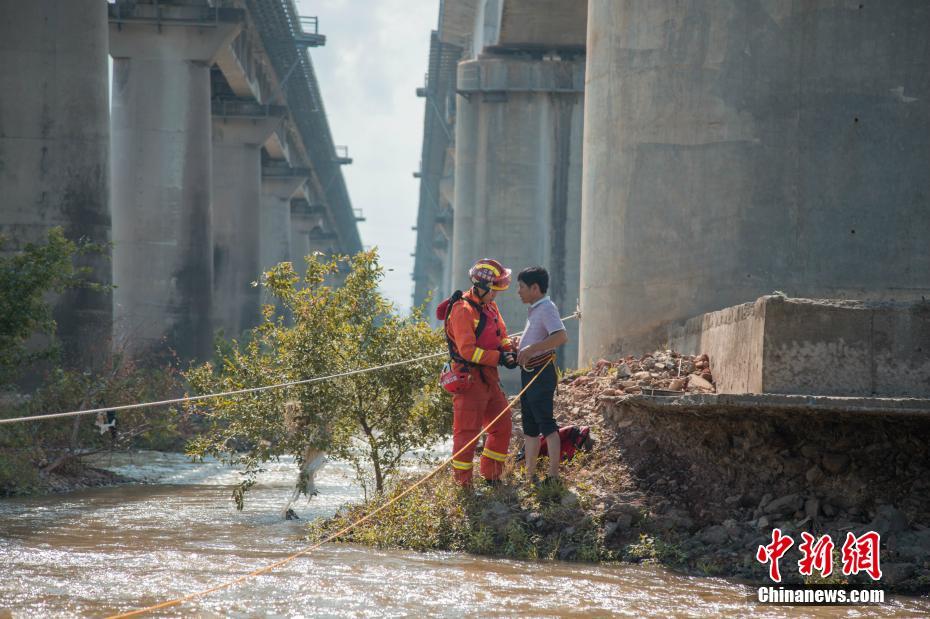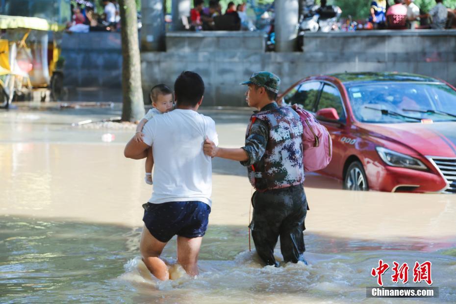 8月11日,两名消防队员营救一名受困市民。受今年第9号台风“利奇马”影响,浙江台州、衢州、宁波等地出现受涝严重、河水暴涨、缺水等问题,各地救援力量纷纷集结,奔赴救灾第一线。中新社发 崔友成 摄