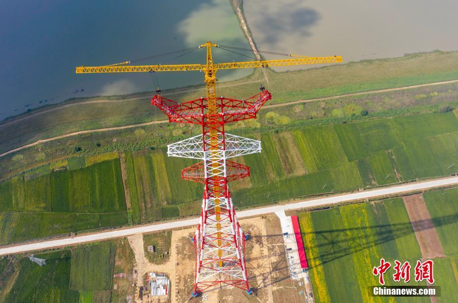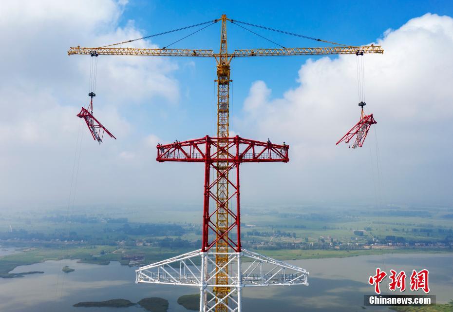 9月4日,在安徽省阜阳市颍上县润河镇,安徽送变电工程有限公司施工人员在270多米高空中安装500千伏淮河大跨越工程北岸跨越塔横担。 当日,历经施工人员66天的建设,由安徽送变电工程有限公司承建的六安市石店变电站至阜阳市500千伏输变电工程淮河大跨越北岸跨越塔成功封顶。该工程属安徽省“十三五”重大能源项目,淮河大跨越由两座跨越塔、四座锚塔组成,为目前淮河边最高的输电通道铁塔,整个工程计划在2020年1月底实现全线贯通。图为9月4日,在安徽省阜阳市颍上县润河镇,500千伏淮河大跨越工程北岸跨越塔横担在275米高空中成功就位。 中新社发 郑贤列 摄 图片来源:Cnsphoto