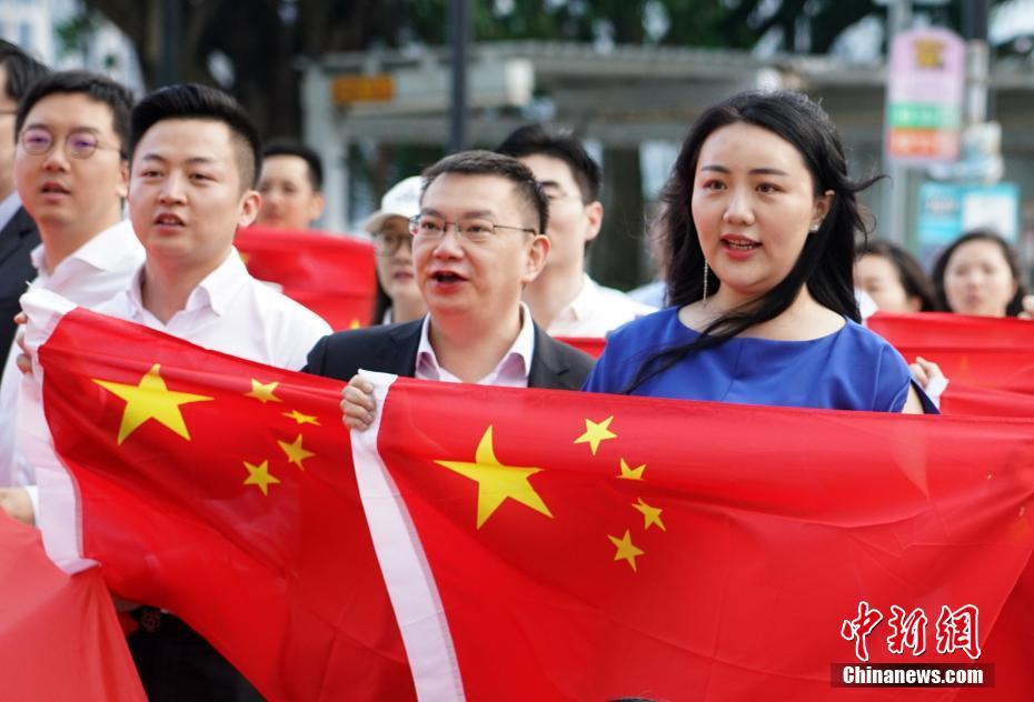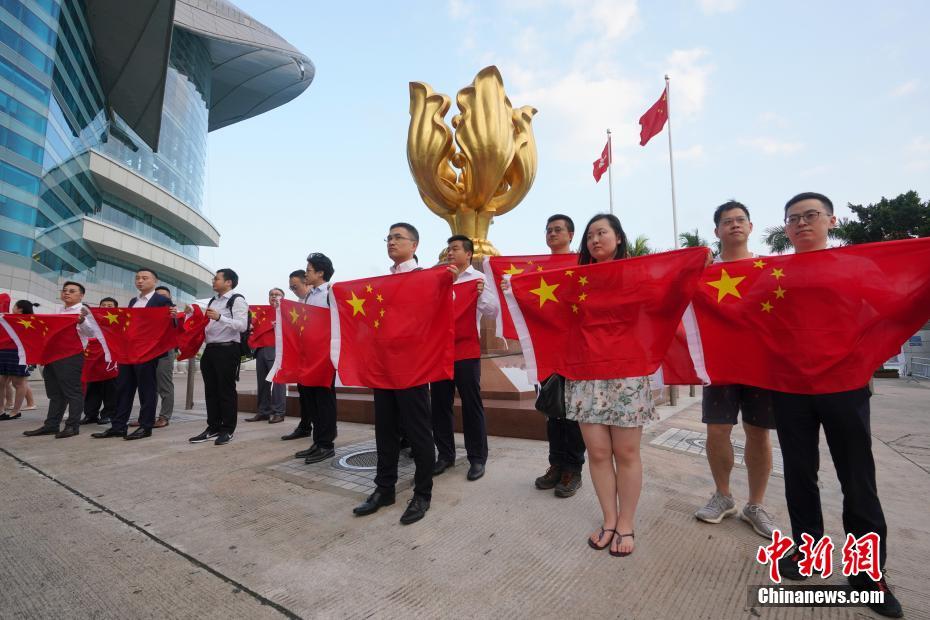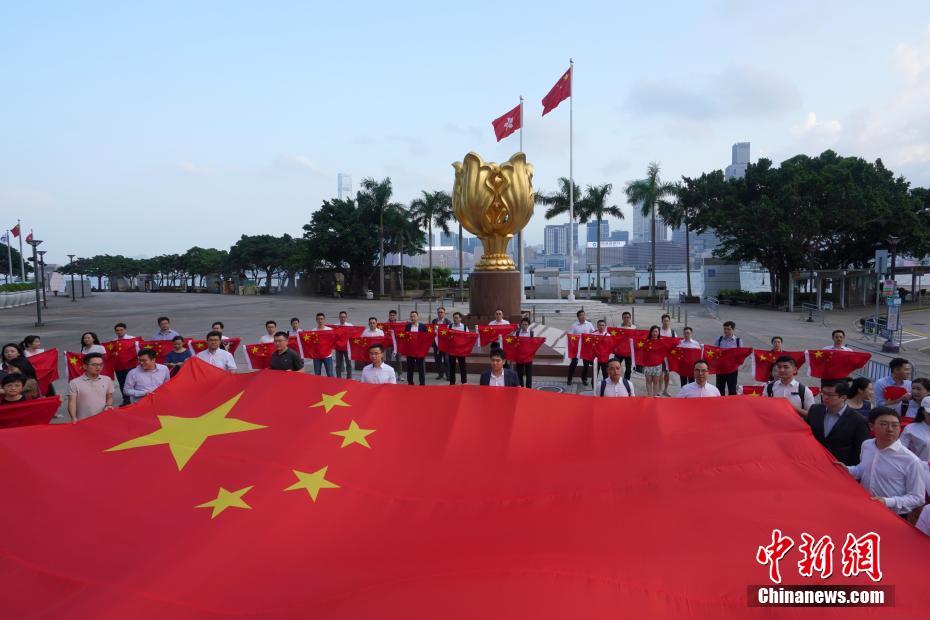 9月17日清晨,百名香港各界青年在金紫荆广场参加“我与国旗·金紫荆同框”活动,展示70面五星红旗,高唱国歌,迎接中华人民共和国成立70周年。参加活动的青年呼吁各界同舟共济、以爱止乱,希望香港尽快恢复秩序。中新社记者 张炜 摄