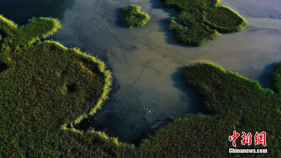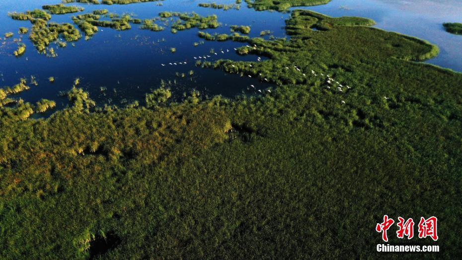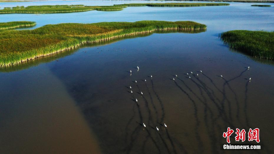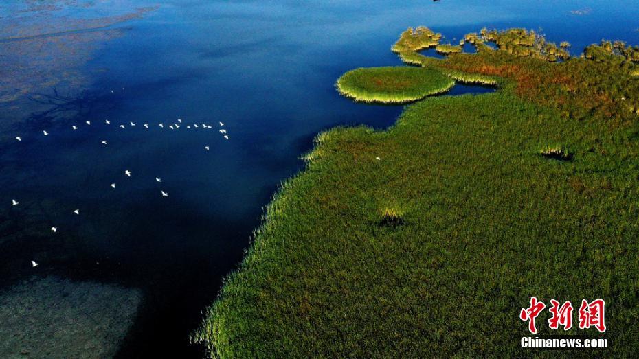 俯瞰甘肃戈壁黑河湿地 秋意浓琵鹭舞