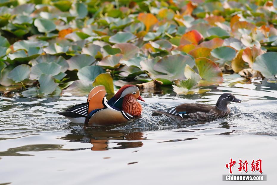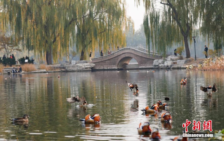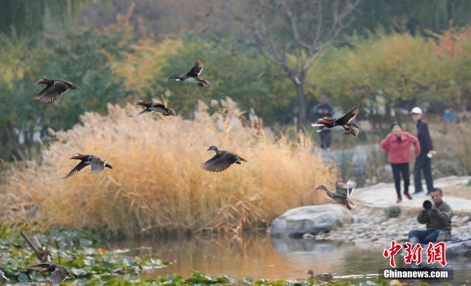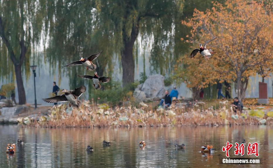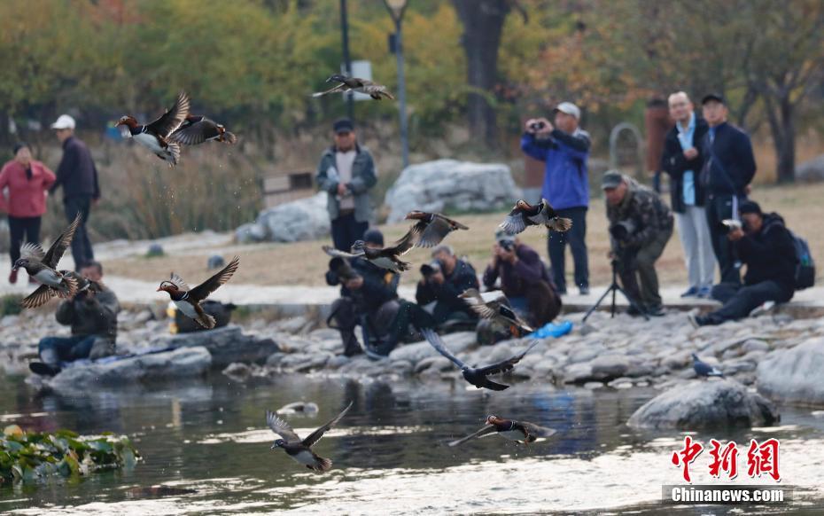 11月6日,北京渐入深秋,大批鸳鸯飞抵北京玉渊潭公园,吸引不少游人前来观鸟、拍照。中新社记者 杜洋 摄