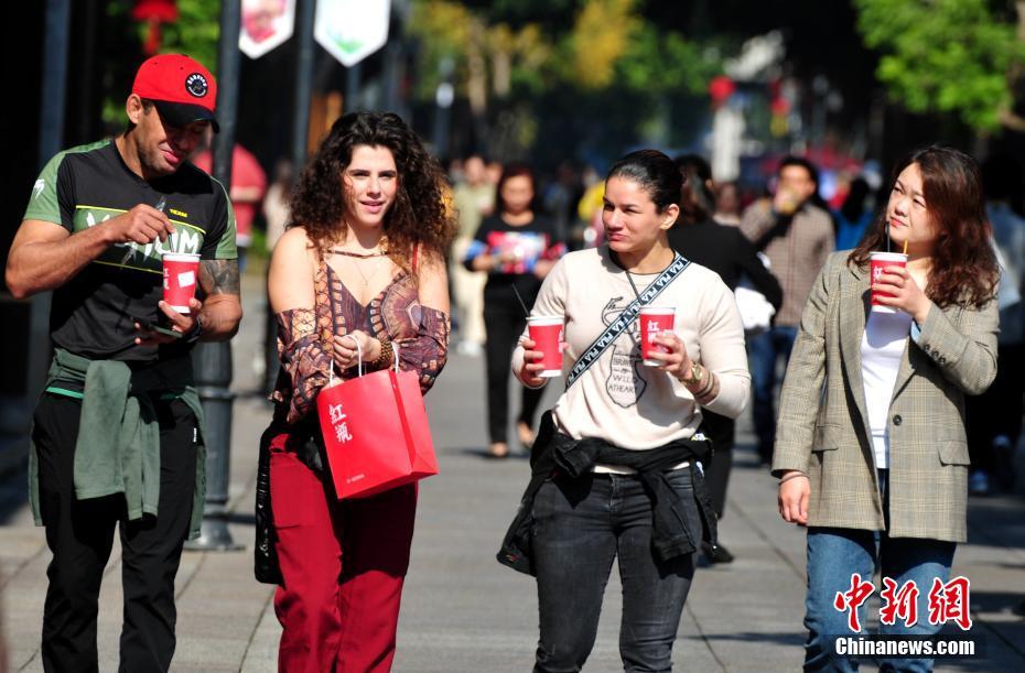 12月17日,福州三坊七巷景区一些外国游客穿着夏装游玩。当日,福州迎来了冬日里的“高温天”,据气象部门预报当日福州最高气温将达到近期的最高点28度。图为游客福州三坊七巷景区游玩。据气象部门预报当日福州最高气温将达到近期的最高点28度。 张斌 摄