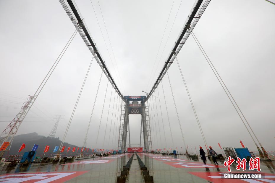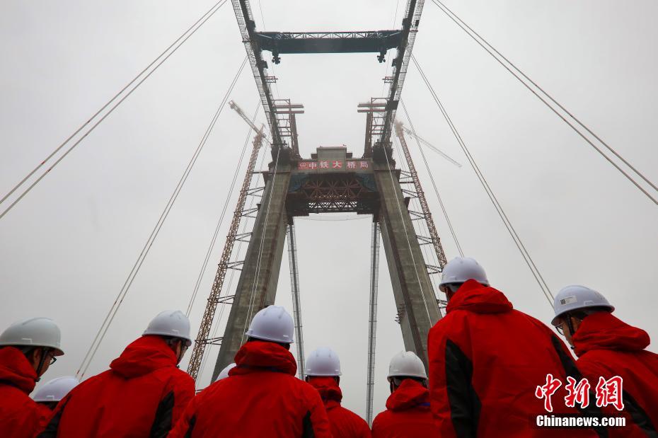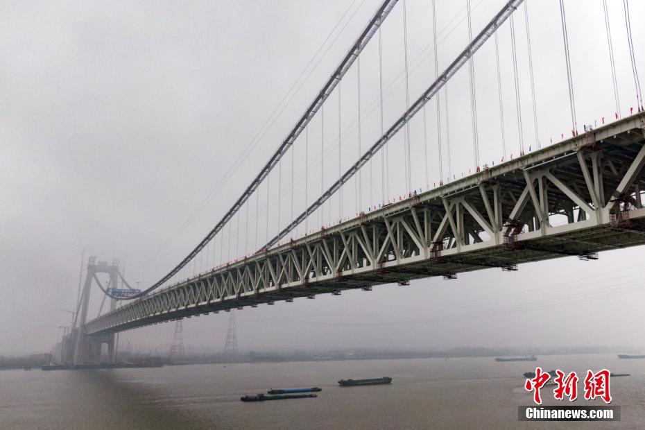 12月26日,随着最后两节钢梁连接处焊接完成,位于江苏镇江的五峰山长江大桥合龙。据了解,五峰山长江大桥全长6409米,主跨1092米,下层为4线高速铁路,上层为双向8车道高速公路,是中国第一座公铁两用悬索桥。中新社记者 泱波 摄