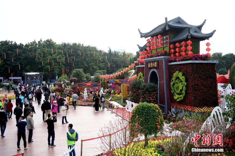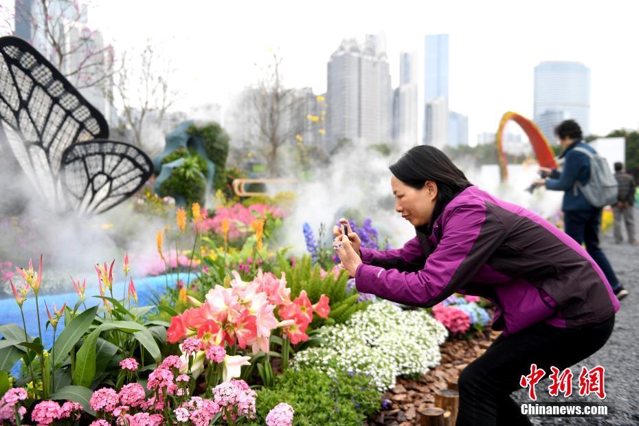 1月20日,第27届广州园林博览会在广州海心沙和花城广场开幕,民众争相赏花拍照。本届园博会以“绽放”为主题,突破往年以小园圃绿雕作品为主的布展形式,增设6个综合展览,布展面积达到10万平方米,打造了一场集游赏玩乐为一体的新春赏花嘉年华。图为民众观花拍照。中新社记者 姬东 摄