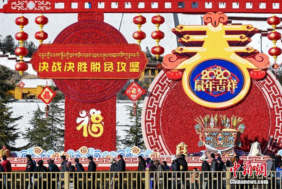 1月20日,随着春节和藏历新年的日益临近,拉萨布达拉宫前搭起了“欢度春节 藏历新年”大型装饰,古城拉萨大街小巷到处洋溢着浓浓的年味。图为当地民众在“欢度春节 藏历新年”大型装饰前合影留念。 中新社记者 何蓬磊 摄