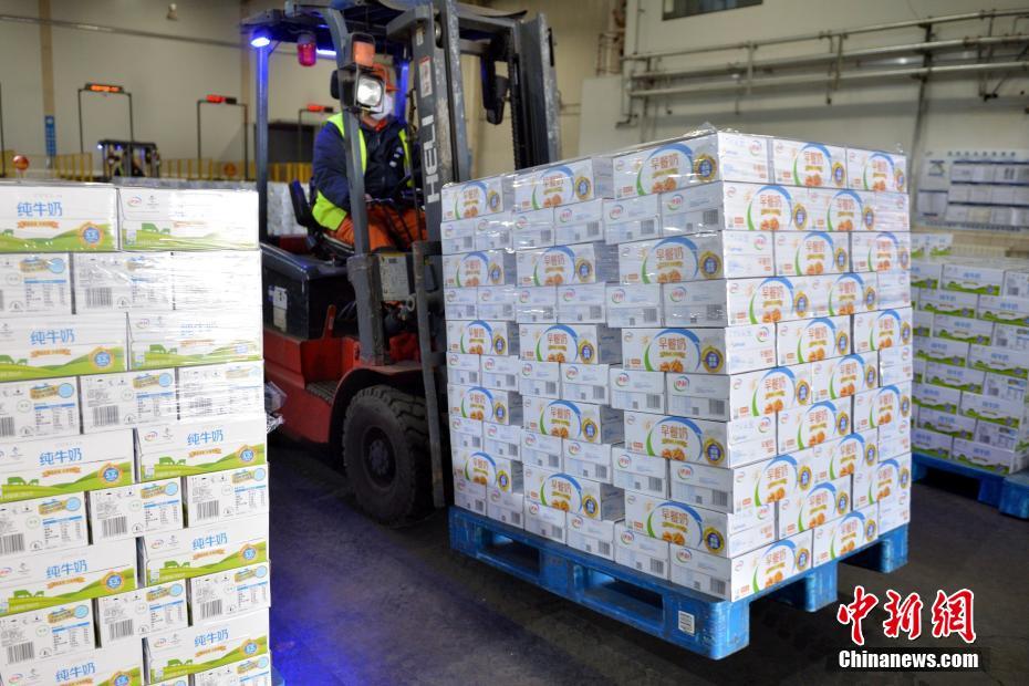 2月11日,工作人员将牛奶堆放整齐,准备装车运往湖北省,支援当地抗击疫情。据介绍,此次支援的物资包括200吨羊肉、100吨牛肉、100吨猪肉和200吨牛奶,将采取空运的方式统一运送。中新社记者 刘文华 摄