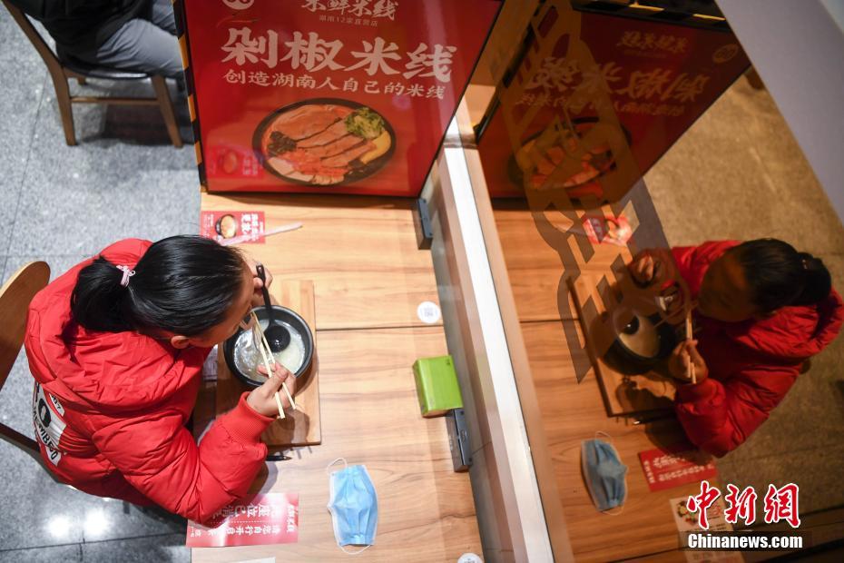 2月12日,顾客正在餐厅就餐。当日,长沙一餐厅推出无接触、无交流就餐,在餐桌之间设置了隔离板,防止交叉感染。 中新社记者 杨华峰 摄