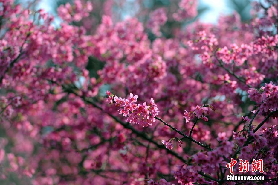2月17日,广西南宁市石门森林公园的“樱花谷”内,大片红樱花已进入花期。