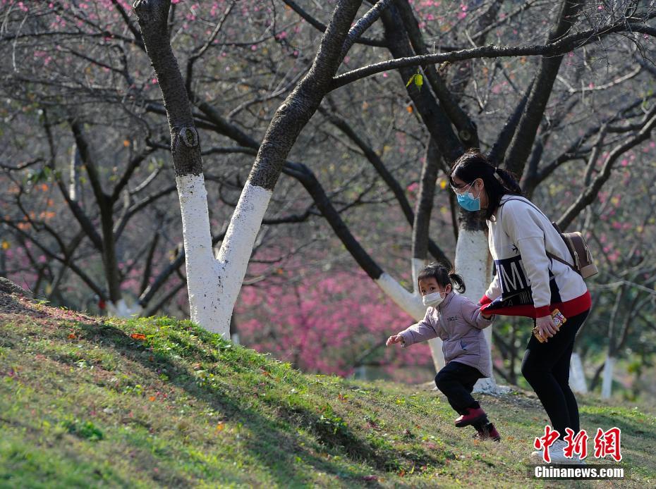 广西南宁樱花盛开 市民戴口罩观赏