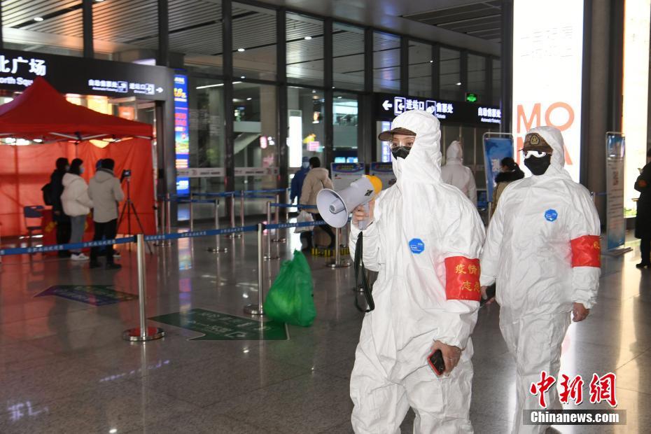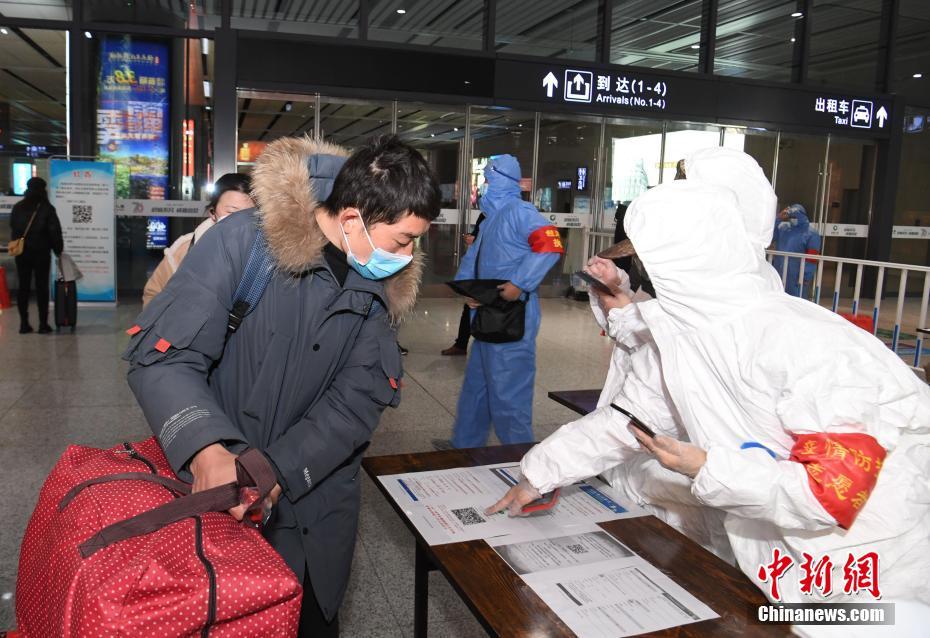 2月18日,合肥高铁南站出站口,安徽合肥义城街道女子民兵引导出站旅客测量体温。复工潮来临,合肥南站紧缺志愿防疫人员,得知消息后,义城街道民兵志愿者第一时间报名,加入到防疫一线队伍中,引导出站旅客红外线测量体温,扫码输入健康信息,进行志愿巡逻等。中新社记者 韩苏原 摄