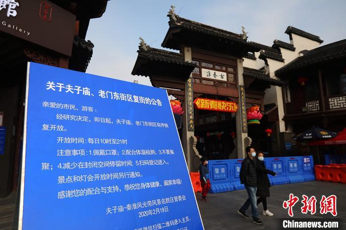 2月19日,受新冠肺炎疫情影响而封闭20多天的南京夫子庙核心景区、老门东街区采取渐进式、可控式有序开放。2月18日晚,南京市新型冠状病毒肺炎疫情联防联控工作指挥部发布《关于优化疫情防控措施加快复工达产的通告》,其中提及,游园绿地、公园广场、室外文化体育设施等公共空间恢复开放,室外旅游景点在控制人流密度的基础上逐步开放。