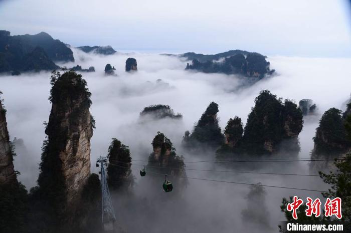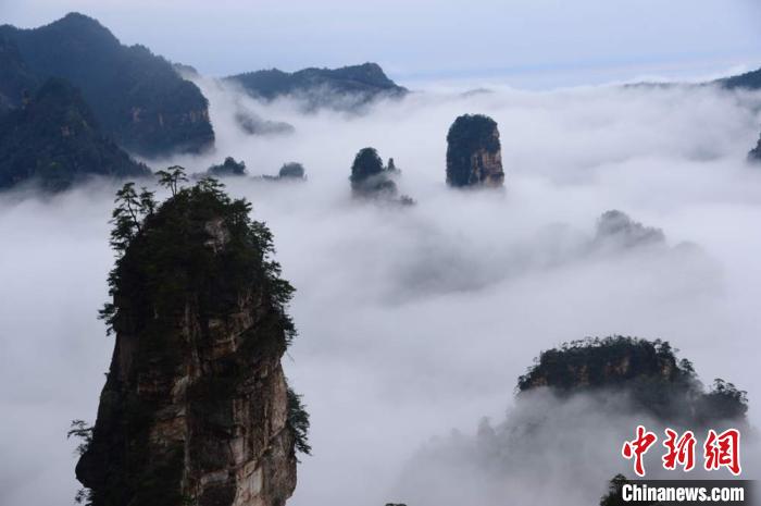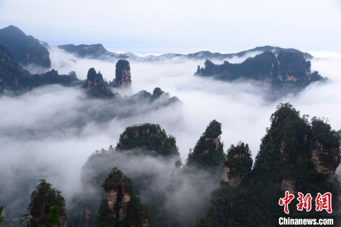 2月29日,刚刚恢复开放不久的世界自然遗产地、中国首个国家森林公园张家界武陵源雨后初晴,黄石寨、天子山等景区出现大面积长时间云海美景,宛若天然的水墨画卷,惹人流连忘返。