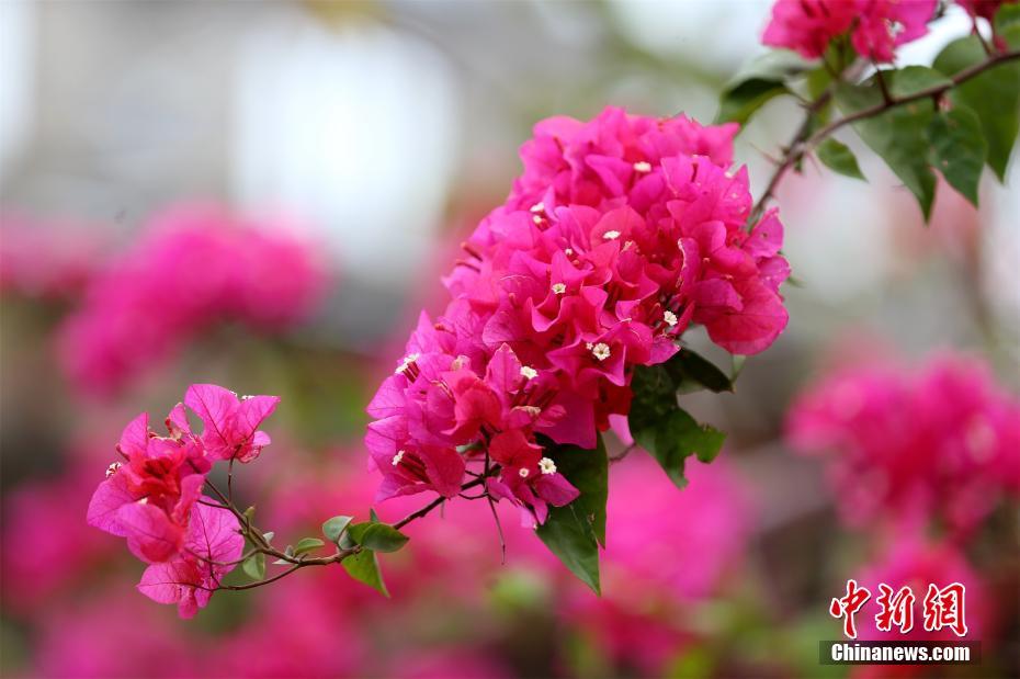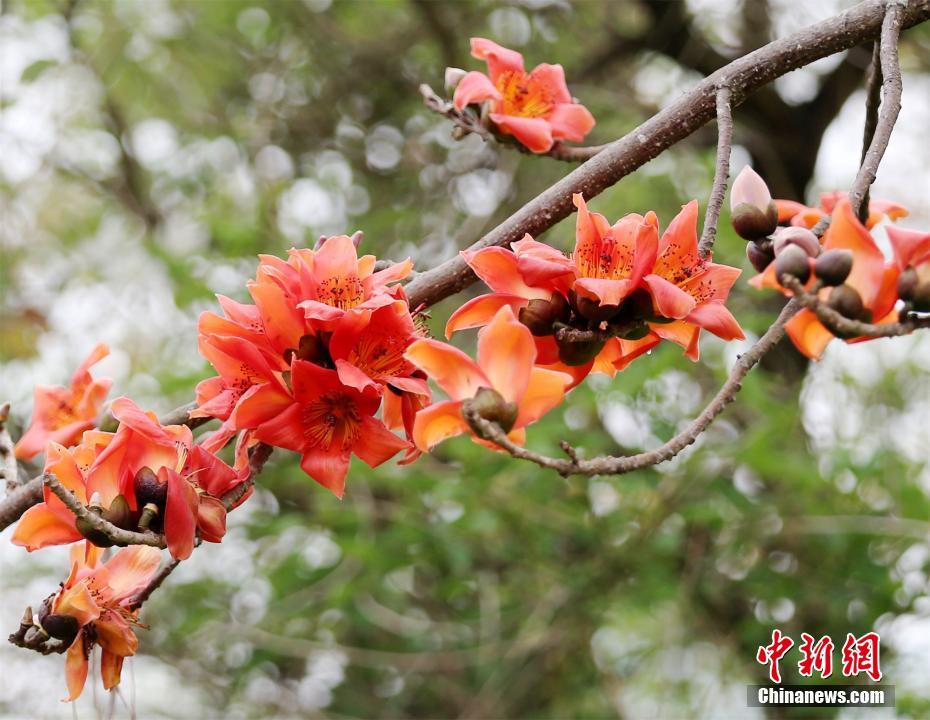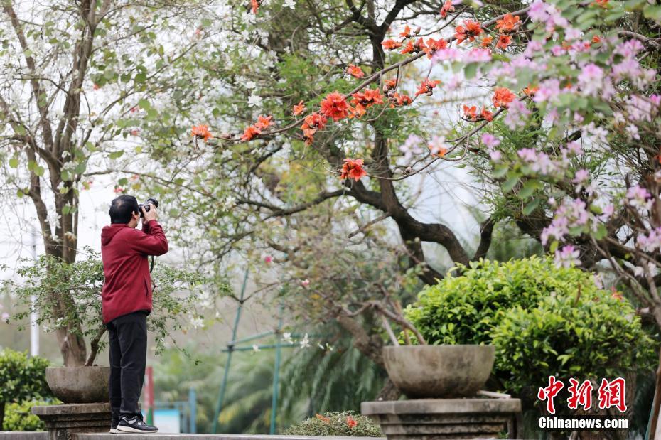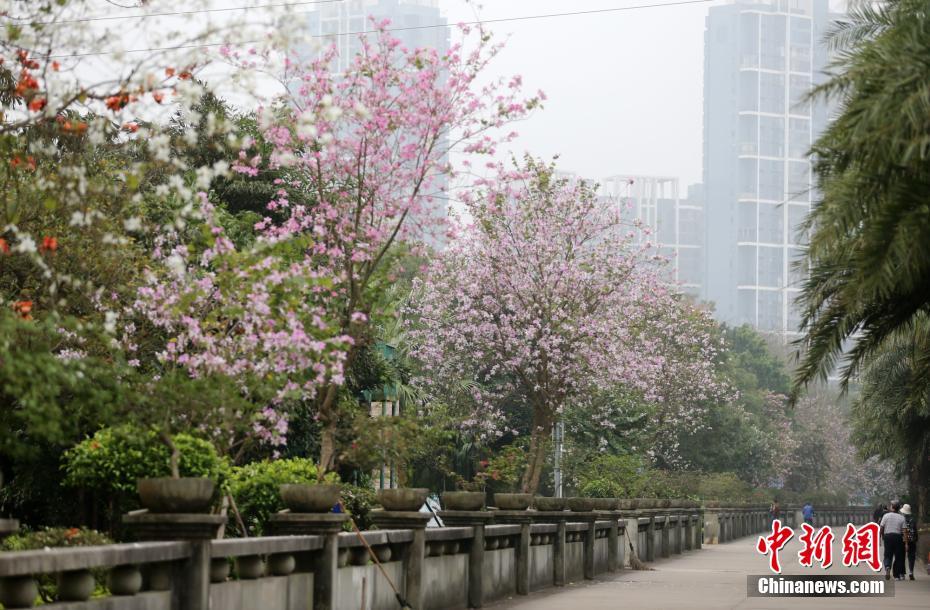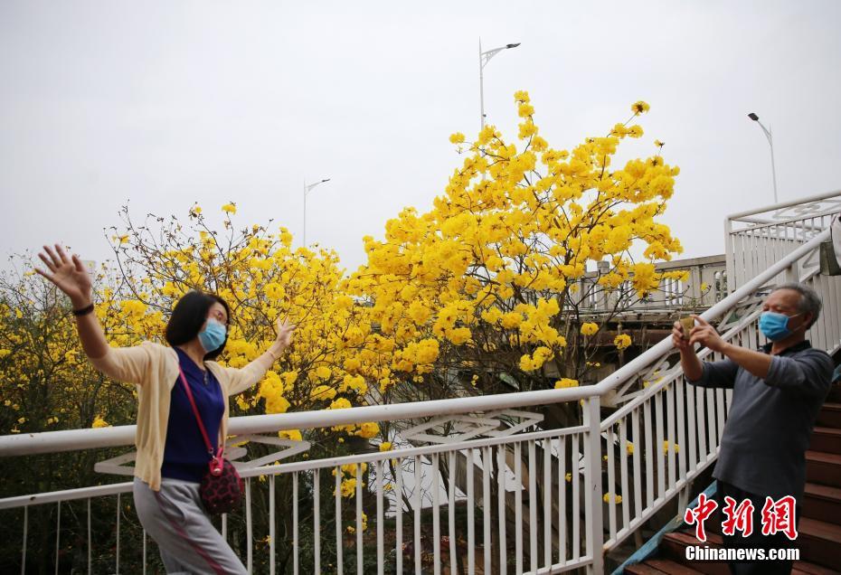 连日来,随着气温的转暖回升,广西钦州市百花齐放,色彩纷繁的鲜花把这座岭南古城装扮得美轮美奂,芳香怡人。图为市民在钦州市钦江岸边盛开的黄花风铃下晨练。曾开宏 摄