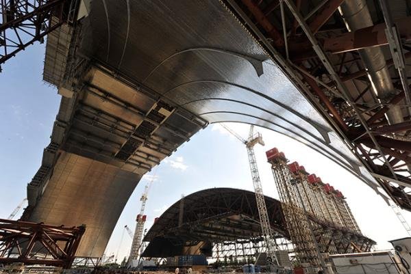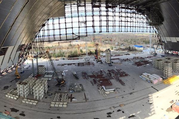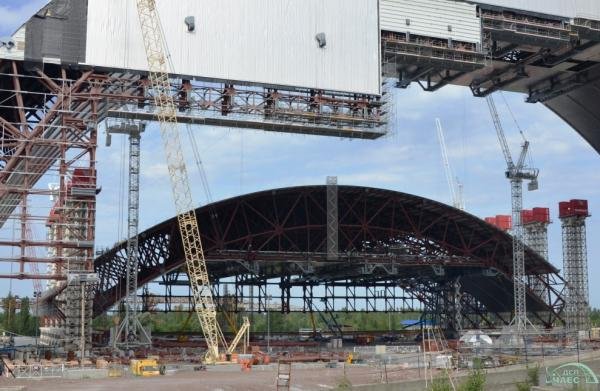因其尺寸巨大,负责修建该项目的Novarka公司将保护罩分为“东”、“西”两个部分修建。该工程早在2012年2月就已启动,但直到2015年才将两个组成部分竖直拼接形成拱顶。保护罩本身安插着一个起重机,可用于未来拆除老石棺、反应堆及清除放射性废物。