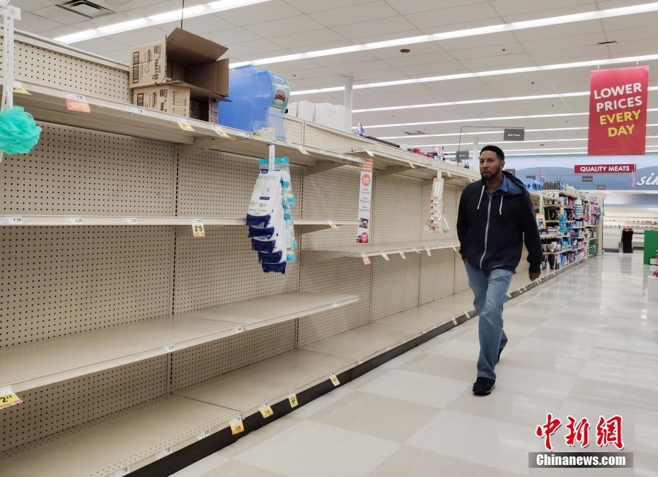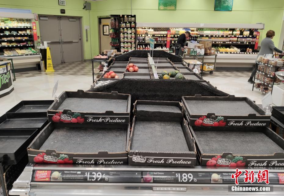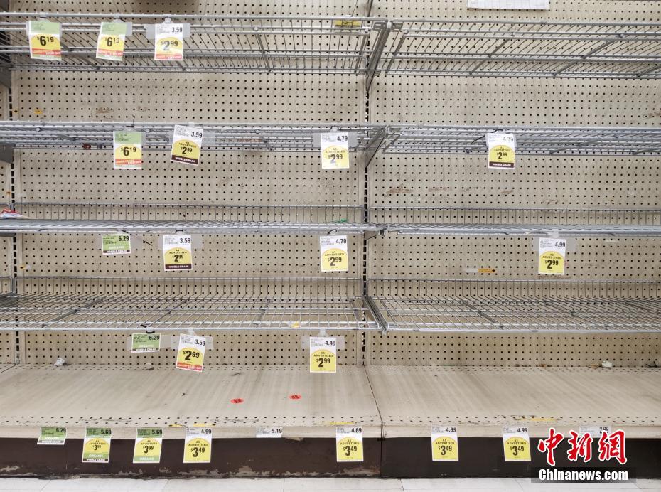 当地时间3月17日,美国旧金山湾区圣马特奥县一家超市的多种商品供不应求。美国旧金山湾区6个县当地时间16日宣布实施出行禁令,从17日开始,要求居民在接下来的三个星期内尽可能留在家中,并与他人保持一定距离。中新社记者 刘关关 摄