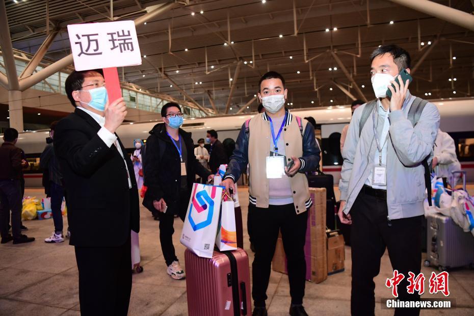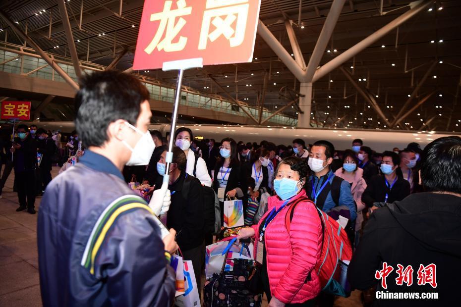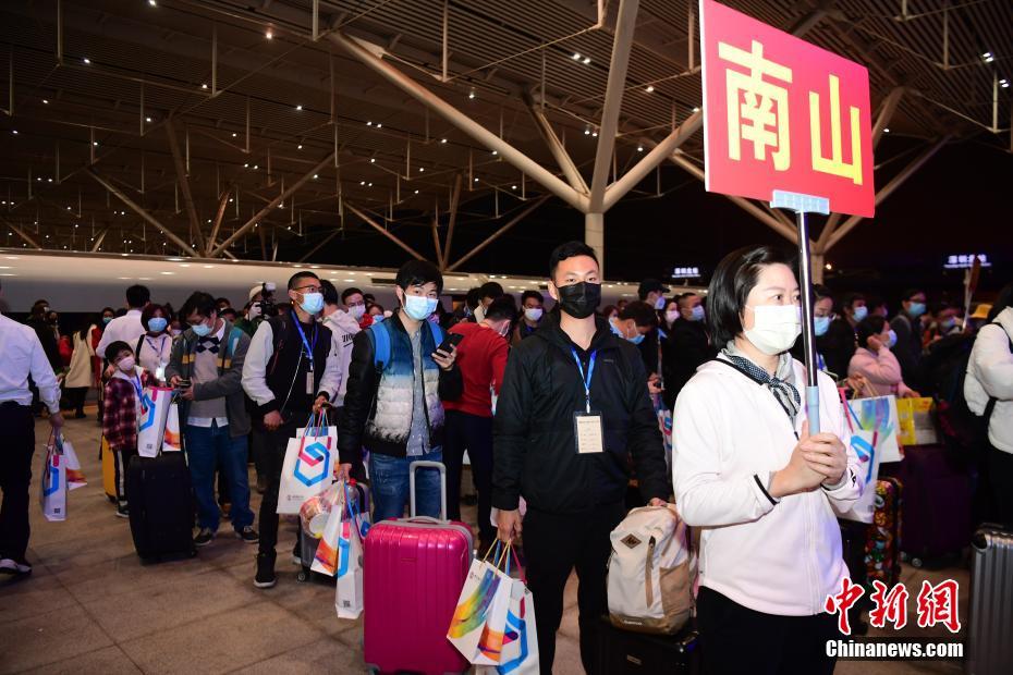 3月19日晚,首趟“点对点、一站式”集中精准输送湖北务工人员G4315次专列抵达深圳北站,该趟专列从荆州发车,共有169人。当晚,深圳市人力资源和社会保障局组织相关部门工作人员前来接站。截至3月18日,深圳市采用专车专列形式共接回员工16703人。中新社记者 陈文 摄
