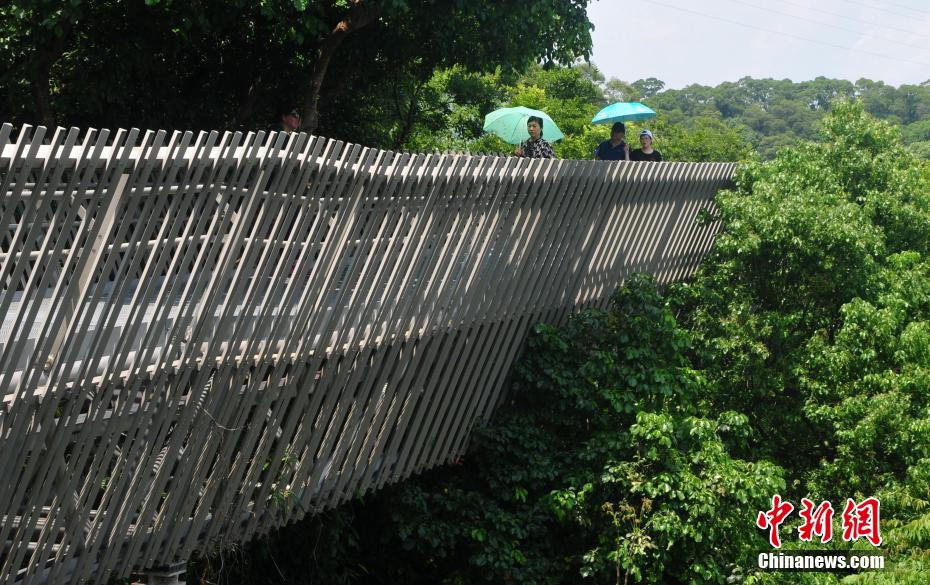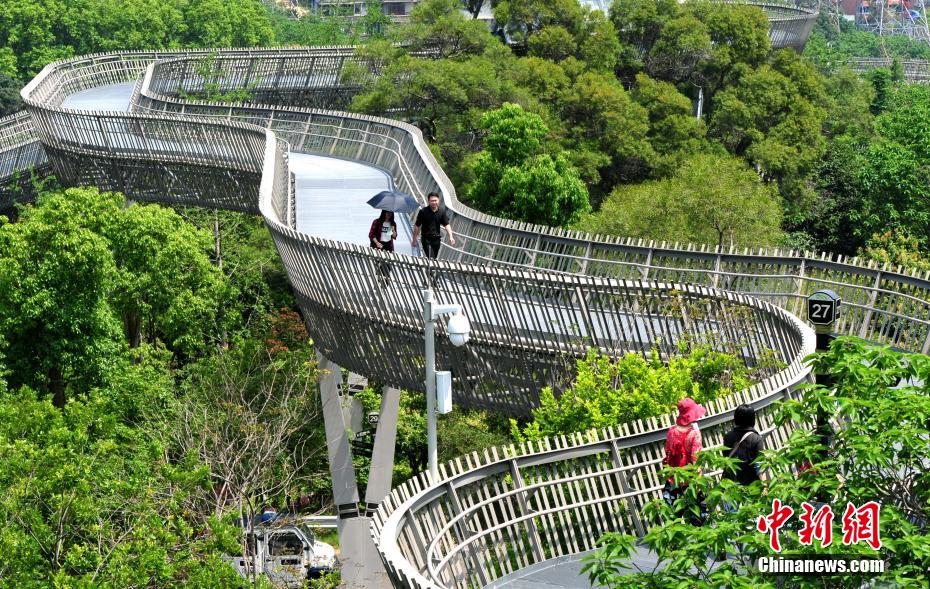 5月4日,市民和游客在福建省福州市的城市绿道——“福道”上漫步。依山势而建的“福道”全线总长约19公里,其钢架镂空的桥面随地势起伏,让民众获得在林间穿梭漫步的体验。图为民众在“福道”上漫步。 张斌 摄