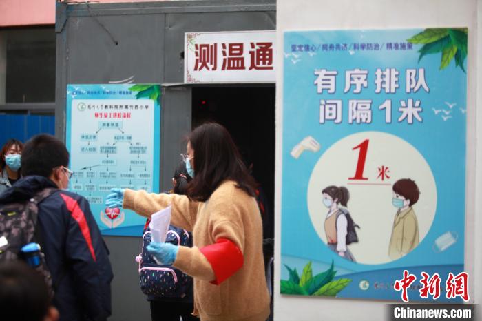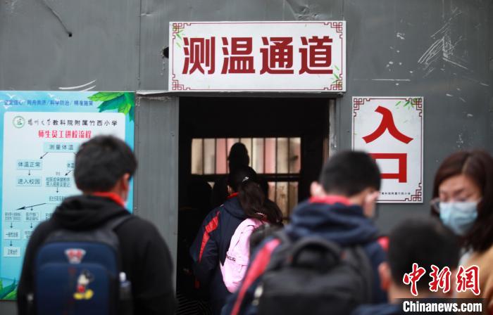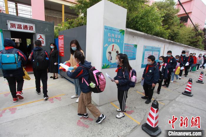 级全部复课。当日返校的小学生相互间隔1米,排队有序通过测温通道进入学校。
