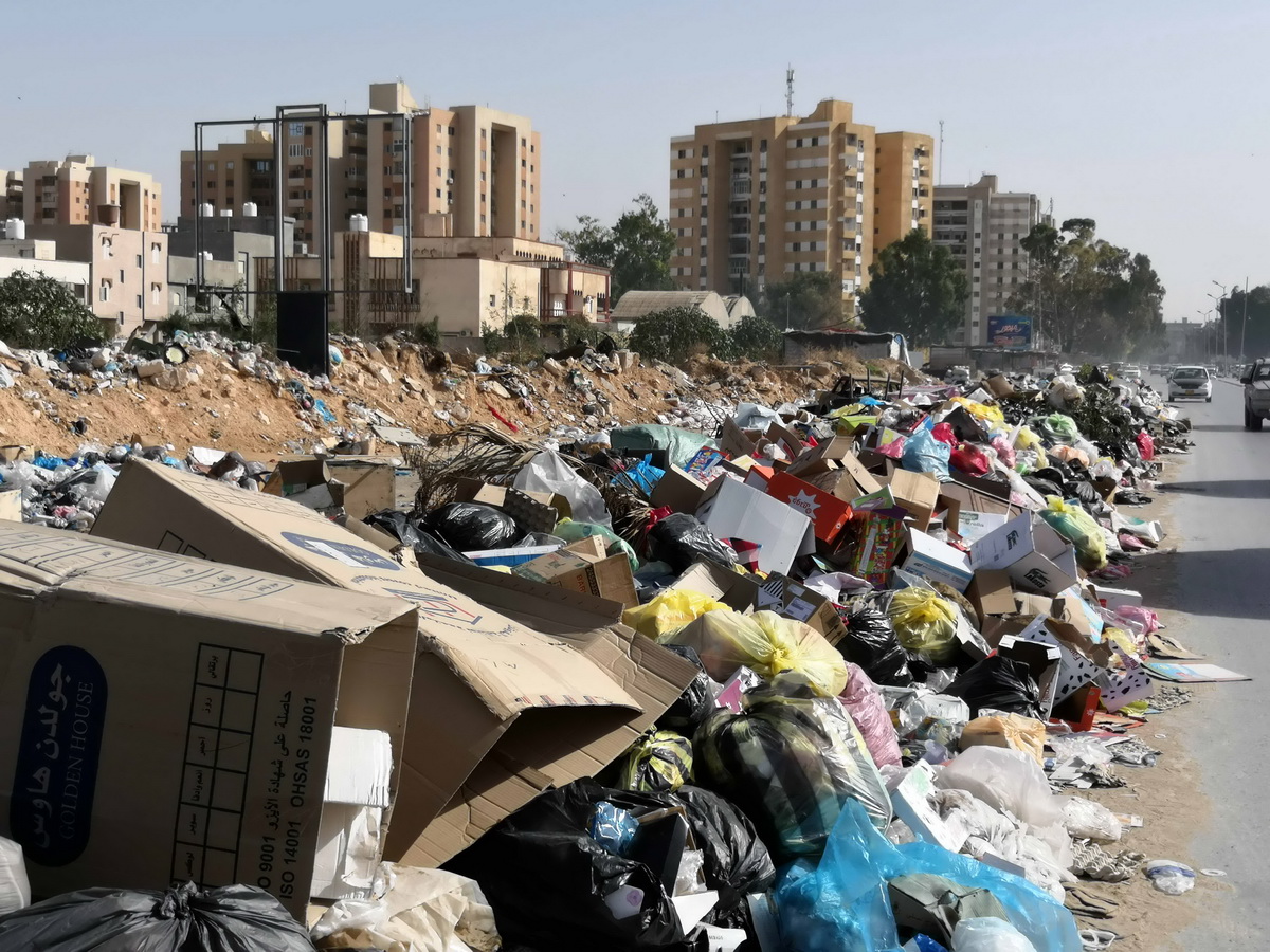 图10 这是2019年11月4日在利比亚首都的黎波里道路旁堆积的垃圾。长年的战乱导致的黎波里城市环境持续恶化。