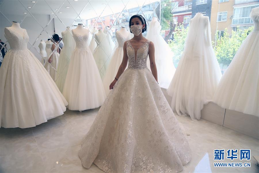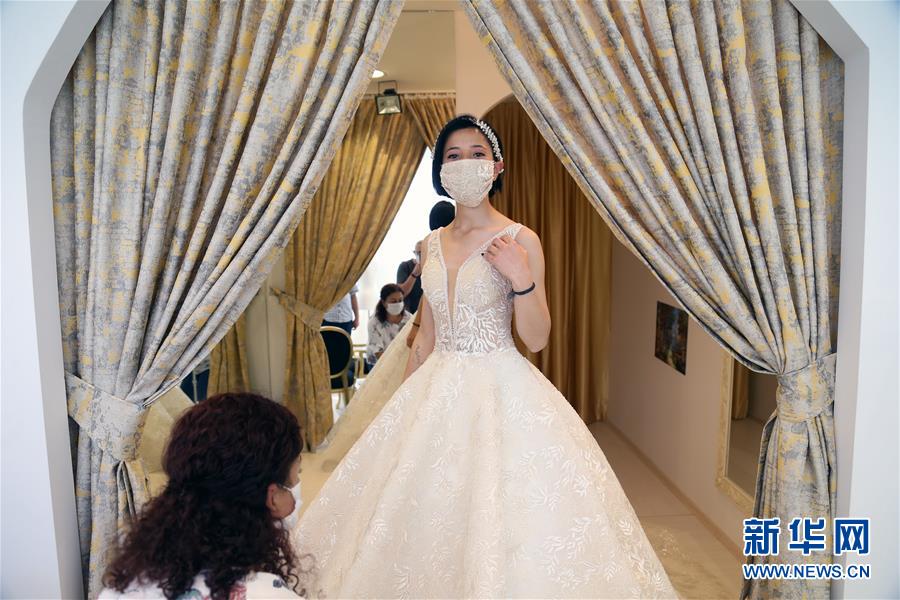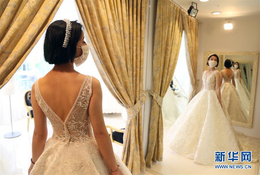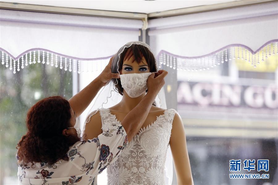 6月6日,一名顾客在土耳其安卡拉试穿一套有口罩的婚纱。