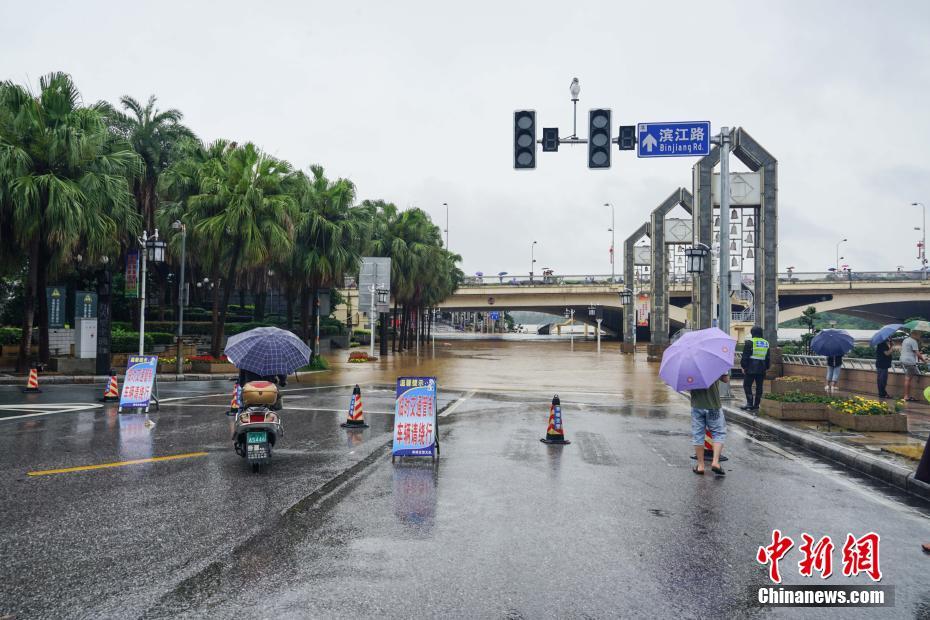 6月9日,受持续强降雨影响,广西桂林漓江市区段出现洪峰,漓江桂林水文站12点00分水位146.50米,超警戒水位0.50米。当天,漓江达到船舶封航水位,桂林海事局今年以来第二次对漓江旅游船舶和排筏同时实施交通管制。图为洪峰通过桂林解放桥。 中新社记者 唐梦宪 摄