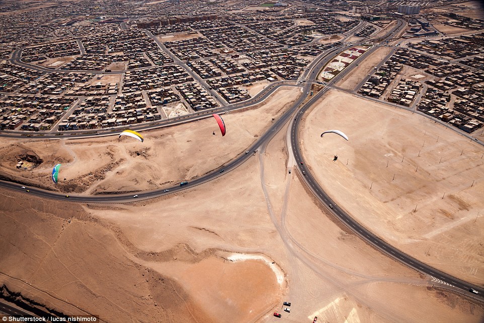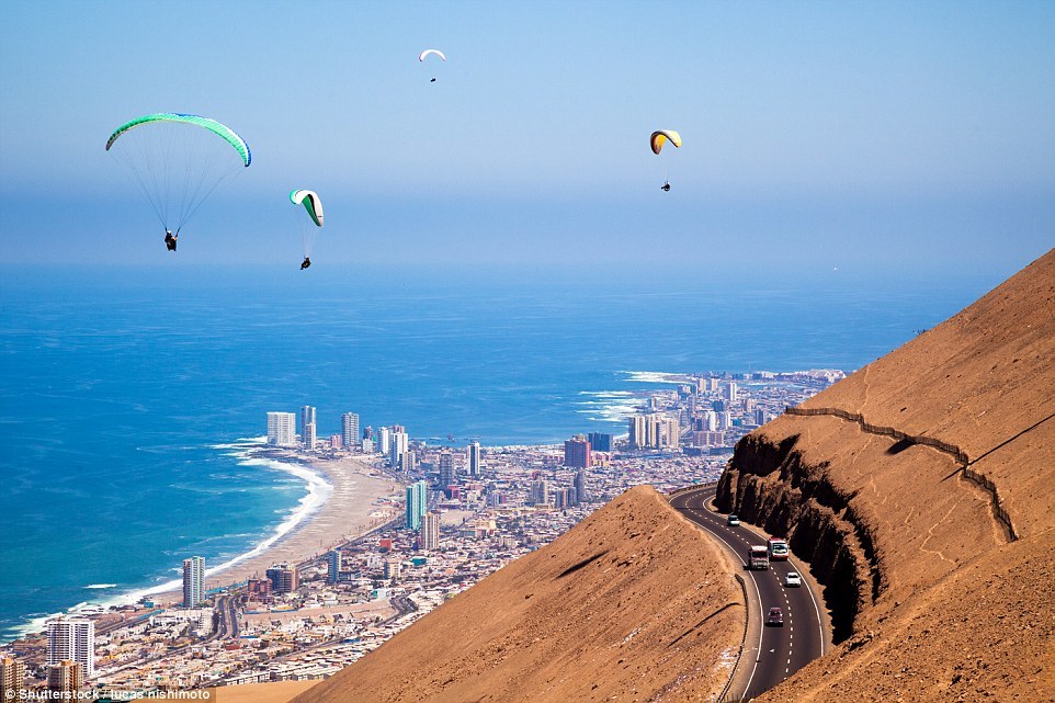 图为滑翔运动员在空中欣赏美丽的伊基克。