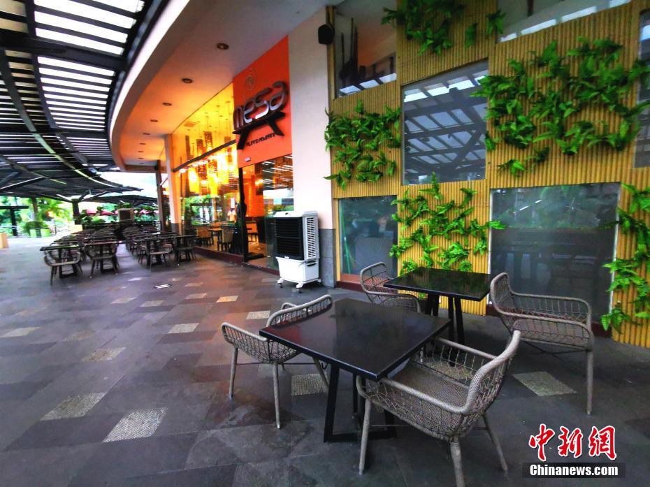 6月14日,菲律宾马尼拉CBD马卡蒂绿带商圈,一户商家将餐厅座位按照要求调整摆放。菲贸工部此前表示,6月15日起该地区普通餐馆将部分恢复堂食,接待顾客的人数不超过总座数的30%。 中新社记者 关向东 摄