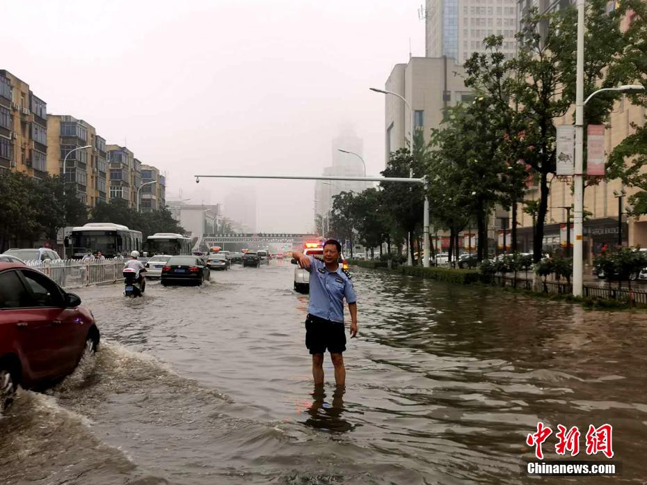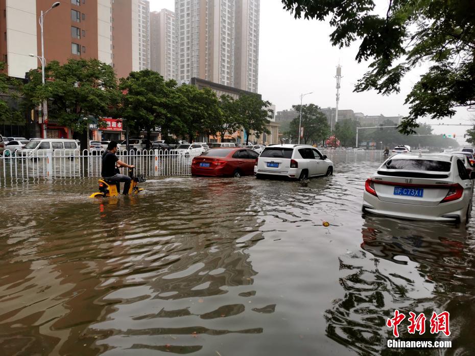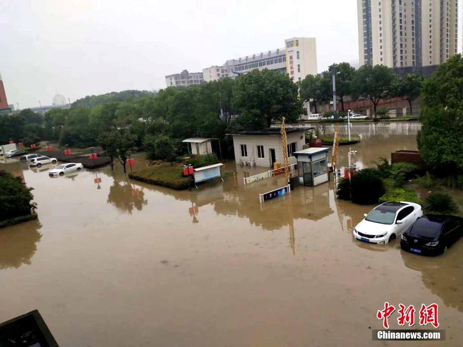 6月15日晚至16日清晨,湖北襄阳市遭遇强降雨,市区多个路段和小区渍水严重,交通受阻,部分公交只好绕道行驶。由于正值早高峰上班期间,不少车辆行驶途中抛锚,部分居民选择徒步趟“河”上班。据了解,从6月15日晚9时起,当地气象部分连发多个暴雨红色预警信号,提醒市民注意防范,辖区交管民警当日深夜就冒雨上路保畅通。图为襄阳市襄州区汉津路渍水,居民趟水上班。 胡传林 摄