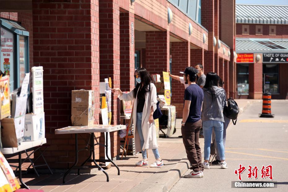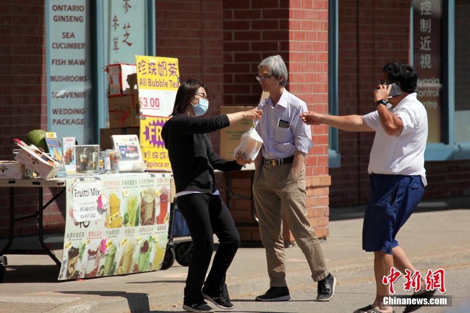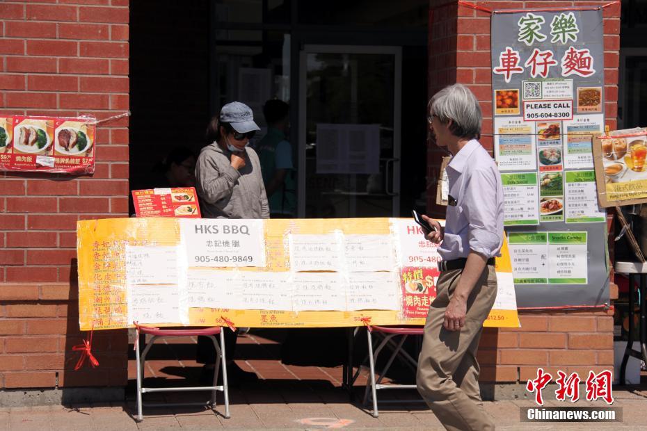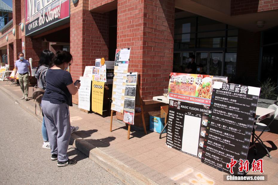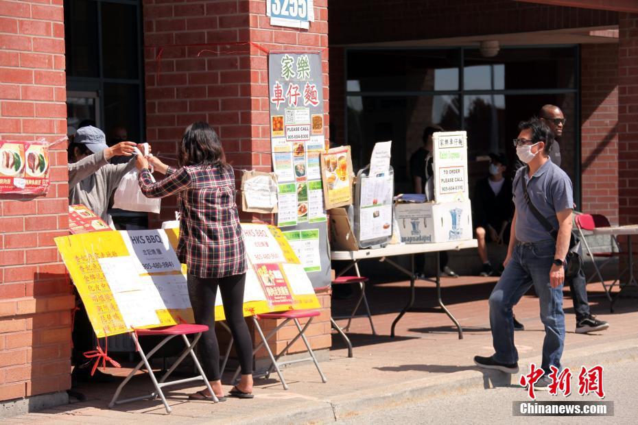 当地时间6月16日,加拿大多伦多,原本在一商场室内经营的华人餐饮业主在商场外摆设摊档,售卖餐食。当地正逐渐重启经济,虽暂仍不允许餐馆经营堂食,但露天食品摊档已可恢复开设。 中新社记者 余瑞冬 摄