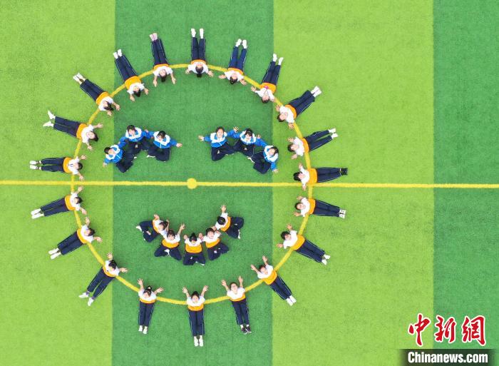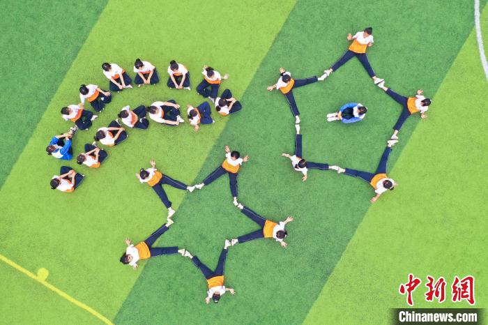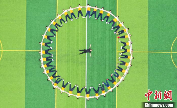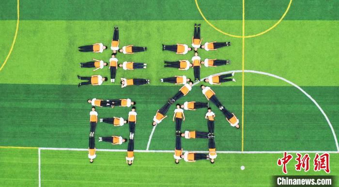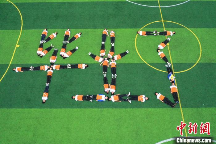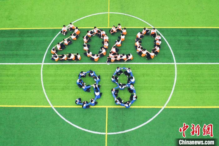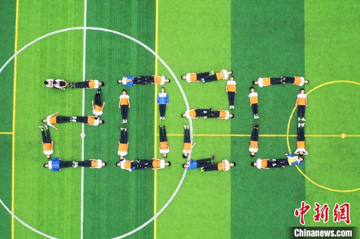 6月18日,江西省瑞昌市第七中学毕业班的初中生们在校内运动场上拍摄个性十足的毕业照片,定格精彩瞬间,为青春留下美好的回忆。身着不同款式校服的学生在足球场上摆出不同的形状图案,一方面寓意着中考顺利,另一方面也是向中学的青春时光告别。