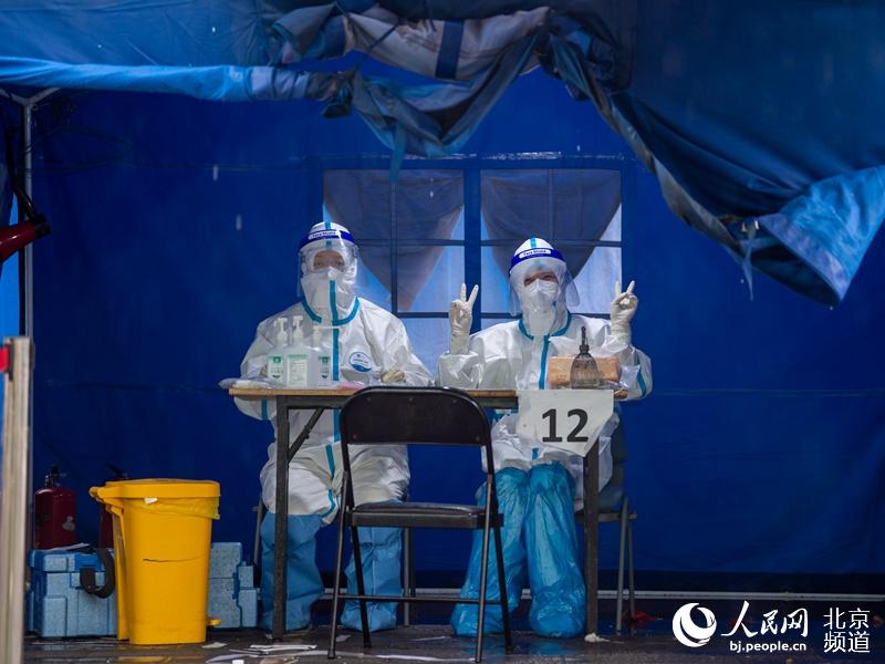 据了解,这处海淀区区级核酸检测采样点,工作人员来自于海淀区疾控中心、各二级医院、社区卫生服务中心及第三方机构,48人分成24组进行,检测时间为早8时-晚11时。现场设置了12个检测台,相关部门全天保障核酸检测现场的后勤保障工作、消杀。