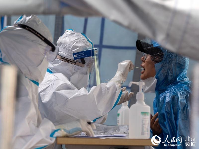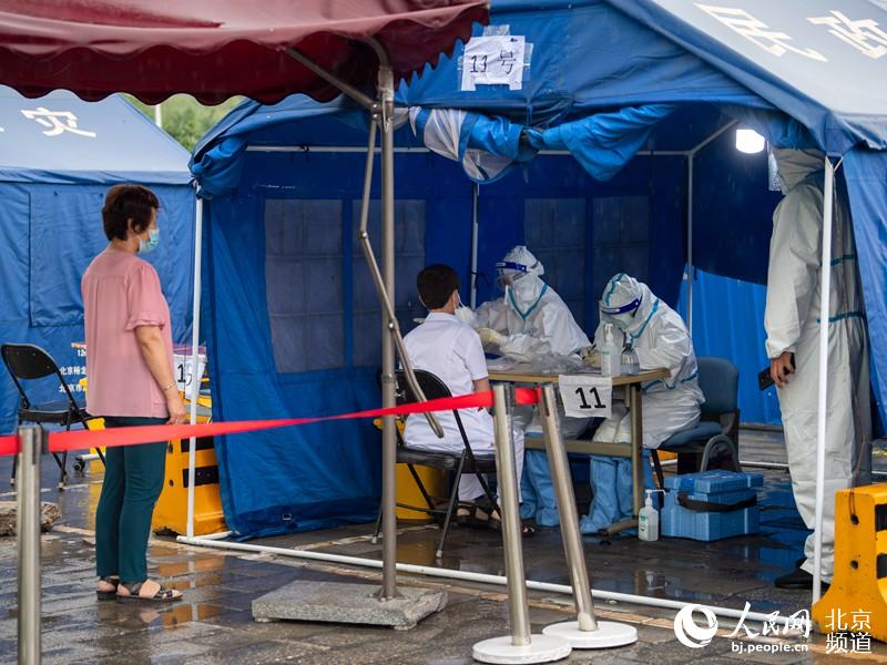 人民网北京6月19日电(董兆瑞 翁奇羽) 18日下午,北京普降雷雨,记者来到海淀区西部的一处区级核酸检测采样点,工作人员正冒雨为市民采集咽拭子样本。为保证市民平安有序接受采样,工作人员准备了雨伞、帐篷等,待采样市民之间间隔一米等待,秩序井然。
