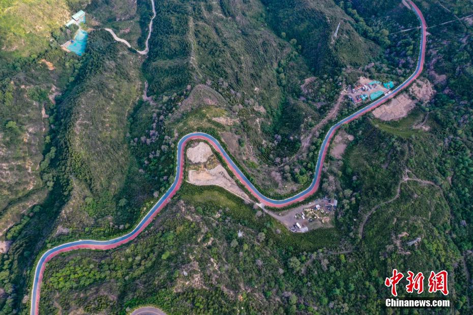 6月29日,山西太原,航拍蜿蜒在玉泉山森林公园中的“彩虹公路”。这段旅游公路铺设了红蓝两色沥青,树木的绿色与彩色路面相互映衬,成为一道独特风景。 中新社记者 武俊杰 摄