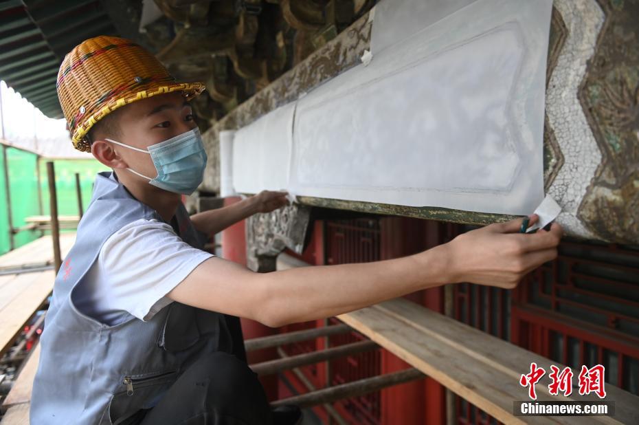 6月30日,辽宁省文物保护工程公共示范和观摩体验活动——沈阳故宫古建筑油饰彩画保护修复二期工程,首场公共观摩体验活动在东所颐和殿举行。记者走进修缮现场,近距离观摩体验古建筑油饰彩画的修复工艺,了解彩画和文物修缮的原则、理念。图为工人在工作中。 中新社记者 于海洋 摄