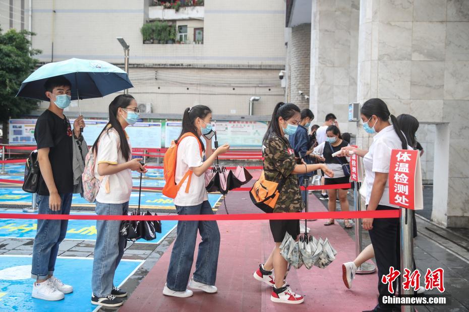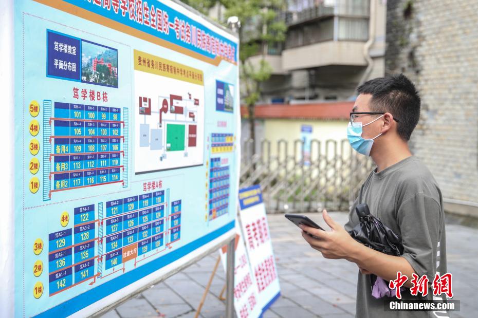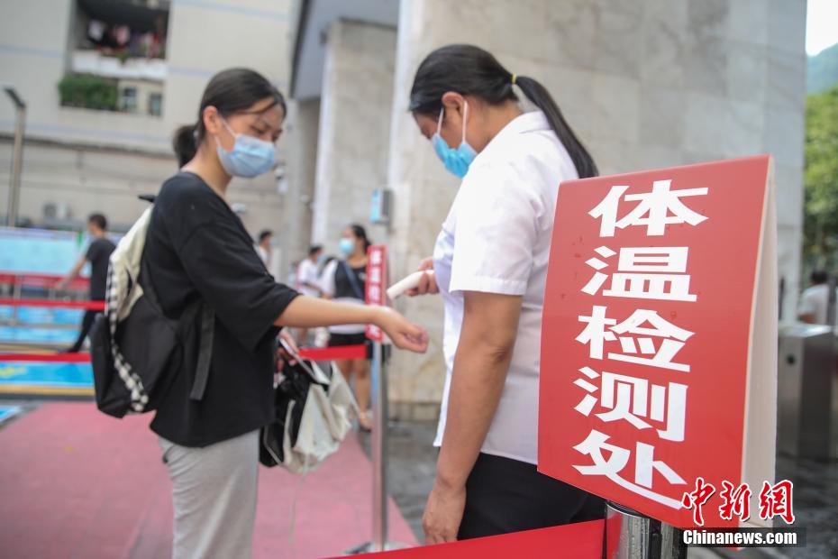 7月5日,2020年全国高考贵州省遵义市务川民族寄宿制中学考点在做好新冠肺炎疫情防控的前提下,安排考生熟悉考场。2020年全国高考将于7月7日开考,该考点共设标准考场83间、备用考场4间、发热考场3间,将有2432名考生在此考试。《贵州省2020年普通高等学校招生全国统一考试防疫工作方案》指出,考点须设置隔离考场,原则上每10个普通考场设1个隔离考场(每考点不得少于3个)。考试当天有发热、咳嗽等呼吸道症状者,须安排在隔离考场考试。图为考生在进入考点前核验身份。 瞿宏伦 摄