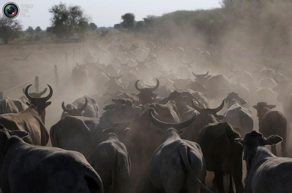皮科马约河干涸后,两岸的其他动物也没有了水源。图为一群牛沿着巴拉圭博克龙的农场寻找水源。