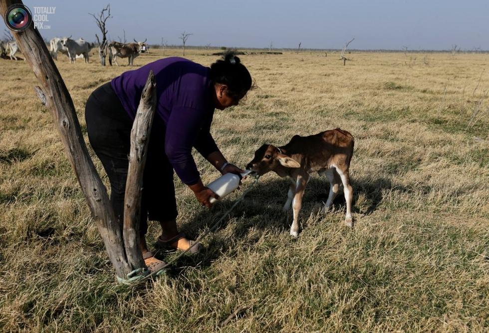 图中这只小牛犊没有了母亲,一名巴拉圭当地女性正在给它喂奶。