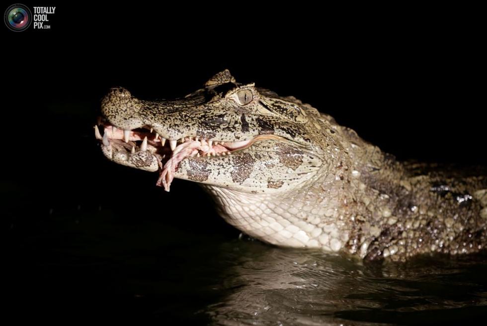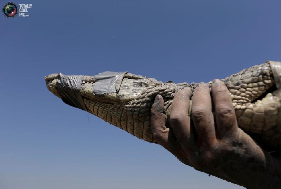 有些幸运的鳄鱼在志愿者的帮助下转移到了人造的池塘中。图为一只得救的鳄鱼正在吃志愿者给它的牛肉。