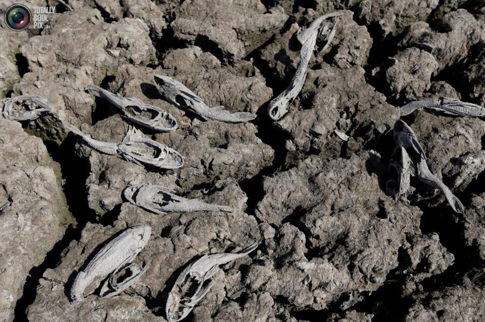 图为巴拉圭的皮科马约河,河水已经干涸,上面有很多死鱼的尸体。