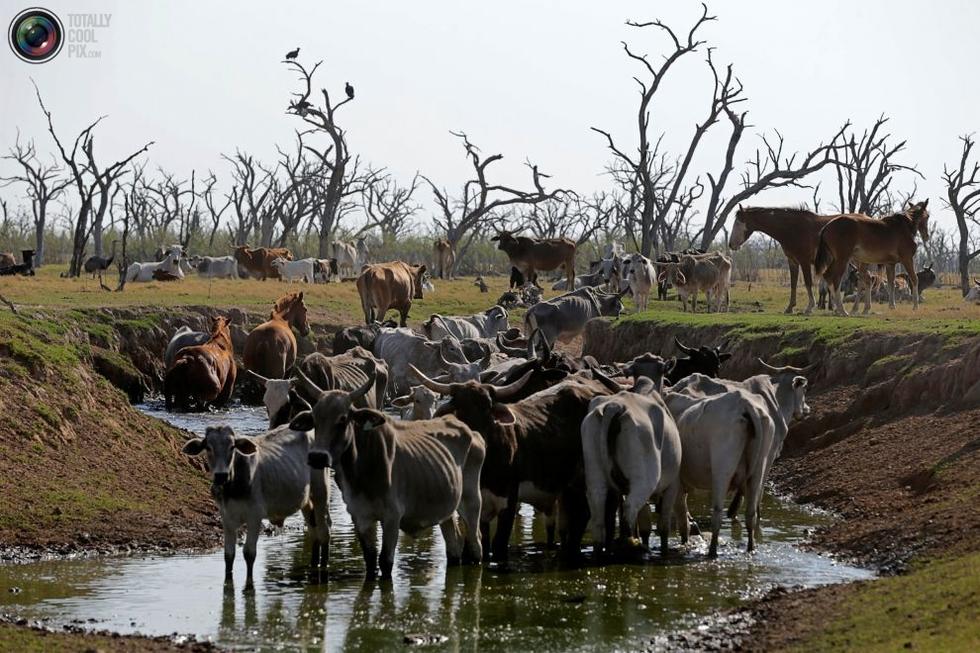 图为一群牛站在巴拉圭博克龙的一个池塘,池塘里的水也在逐渐减少。