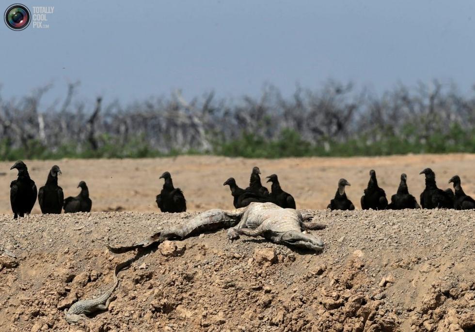 秃鹫围在一条死去的鳄鱼旁边,这里以前是一个人造池塘,但是也已经干涸了。