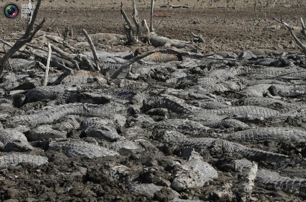 图为一些苟延残喘的鳄鱼趴在已经死去的鳄鱼中间。