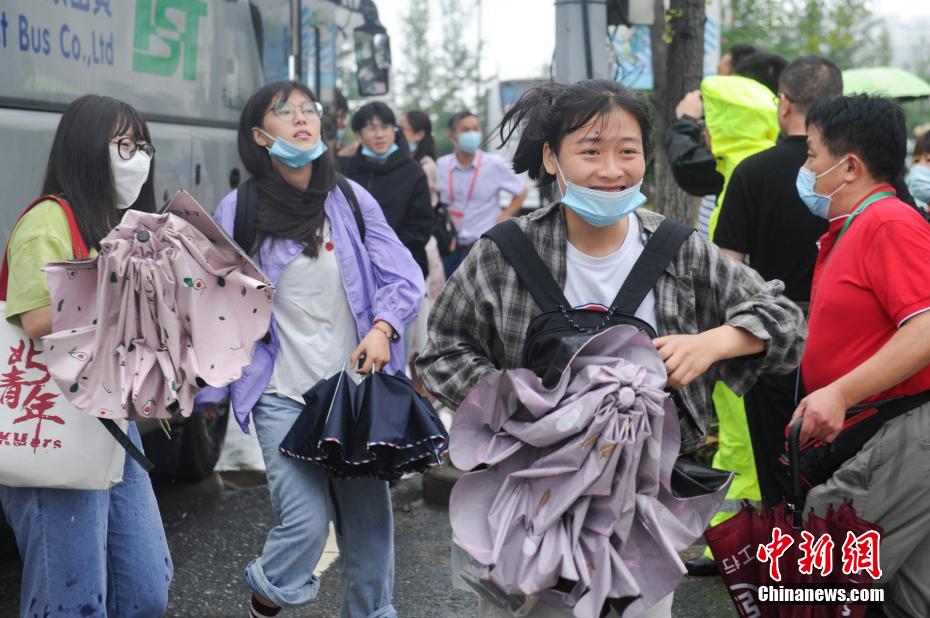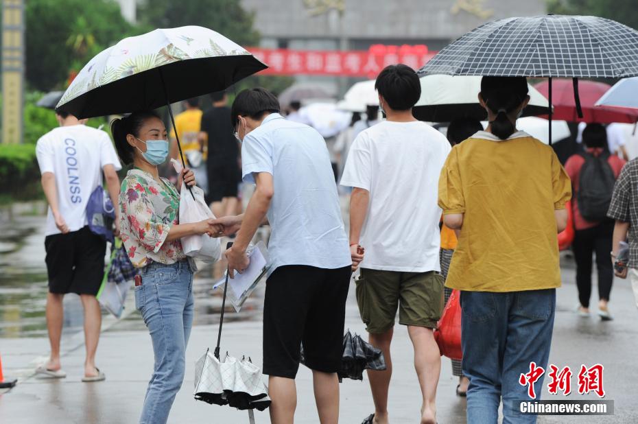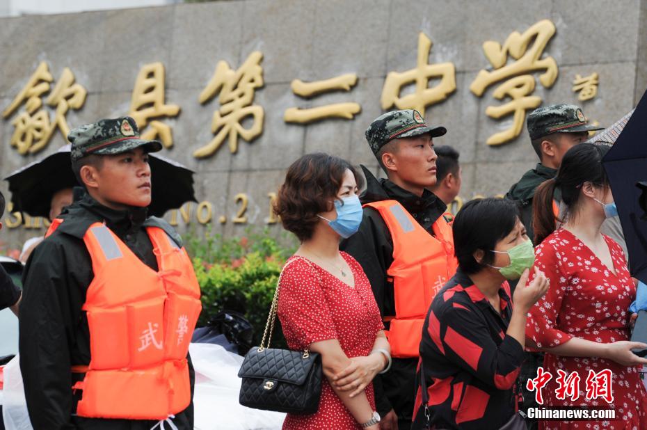 7月8日,在安徽省黄山市歙县二中考点,高考恢复正常,考生准备进入考场。7月7日,安徽省黄山市歙县遭遇50年一遇的洪涝灾害,县城多处洪水上路、严重积水、道路受阻,大量考生无法赶到现场,歙县考区原定7月7日进行的语文、数学科目考试延期至7月9日举行。随着城区积水退去,8日综合、外语科目考试正常举行。图为在安徽省黄山市歙县二中考点现场,考生在测量体温。 张娅子 摄