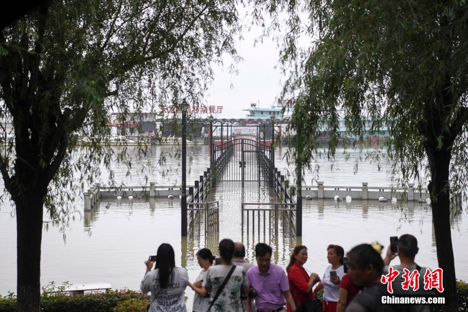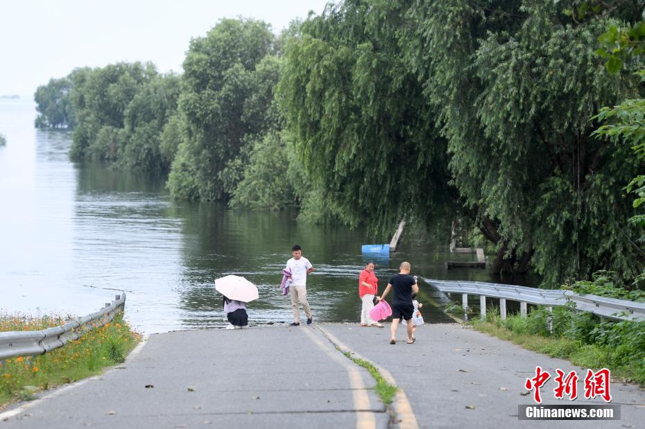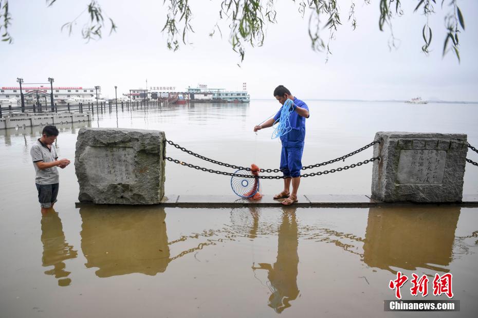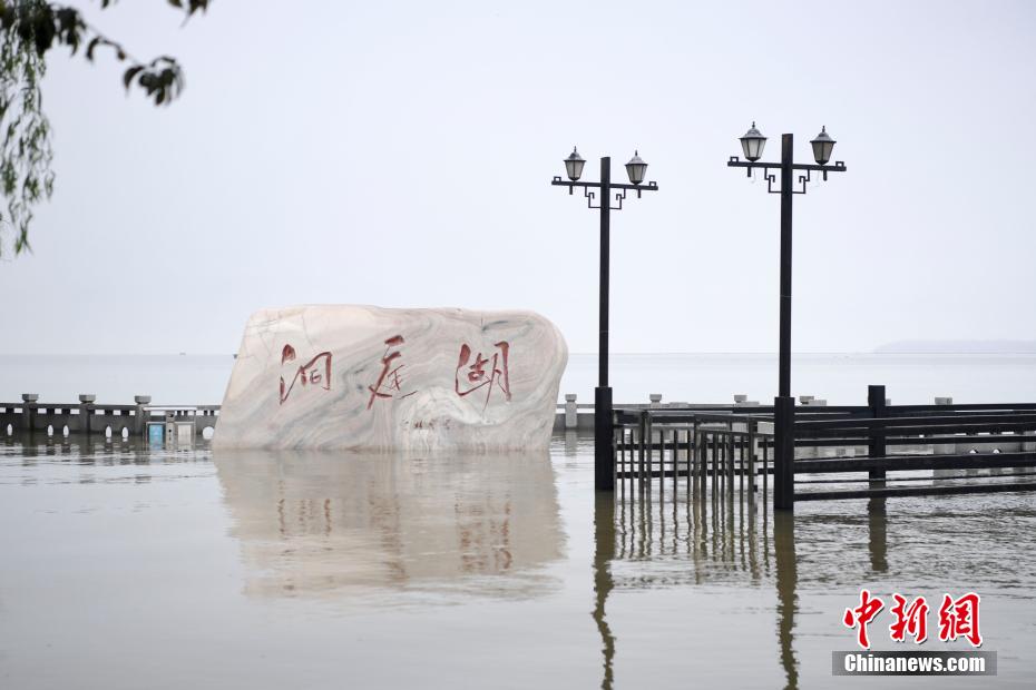 7月9日,湖南岳阳巴陵广场景观道与通往君山岛景区道路已被湖水淹没。当日,湖南省水利厅数据显示,受降雨及长江来水影响,9日7时,洞庭湖区及沅水、澧水共有26个水文(水位)站超过警戒水位。目前,湘、资水相对平静,澧水在退,沅水下游和洞庭湖在涨,环洞庭湖各站全面超过警戒水位。图为岳阳楼下的临湖亲水步道被淹没。 杨华峰 摄