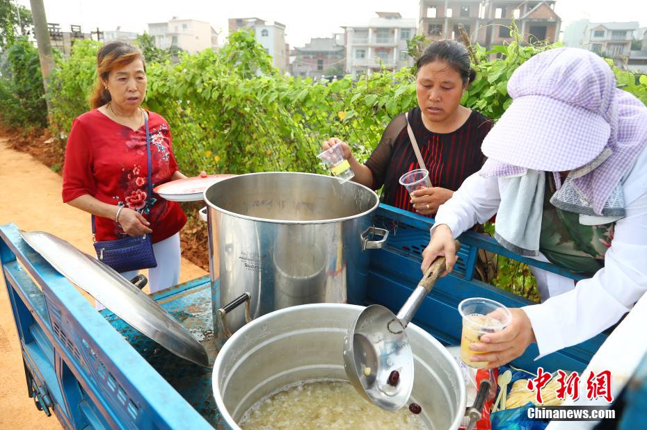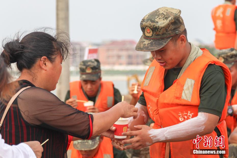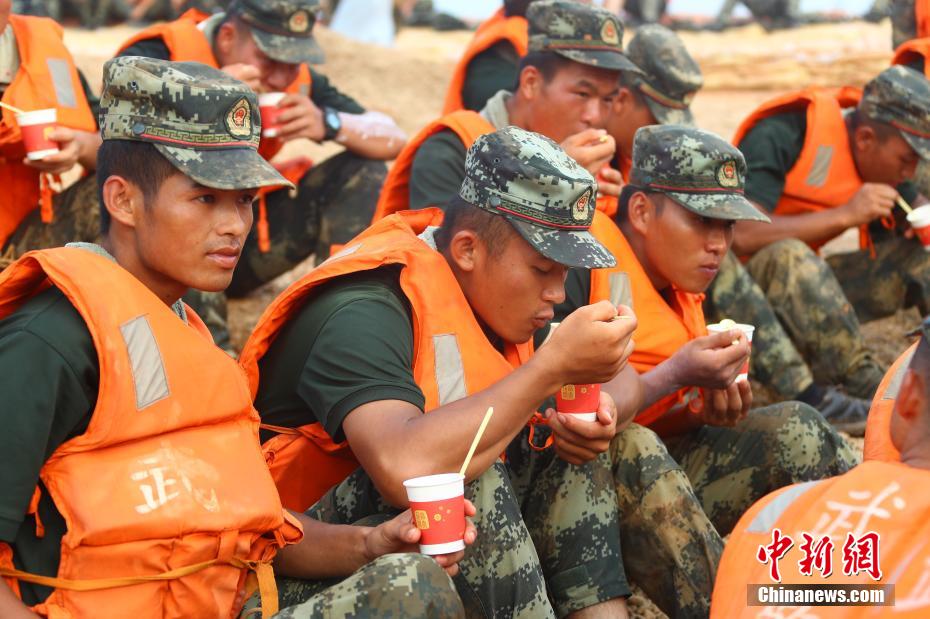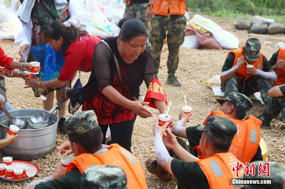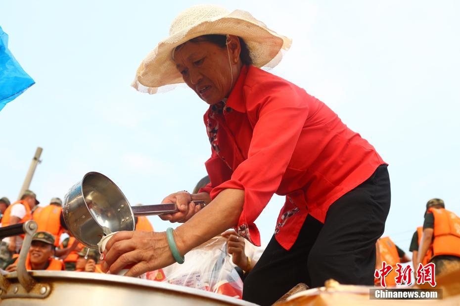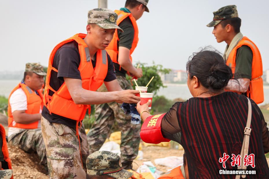 7月15日,在江西省鄱阳县城郊的昌江圩堤上,来自圩堤后方朱家桥村的数位热心中国大妈们,推着小型三轮车,给正在圩堤上执行抗洪抢险任务的部队官兵们送去银耳汤、绿豆汤等清凉解暑食品。近几日,鄱阳县出现高温酷暑天气,部队官兵们在烈日下进行作业,极易发生中暑。64岁的朱家桥村村民朱爱香在微信群里号召平时一起跳广场舞的姐妹们给抗洪抢险部队战士做后勤工作,得到大家的积极响应。图为一位大妈将银耳汤送至参加抗洪抢险的部队战士手中。 刘占昆 摄
