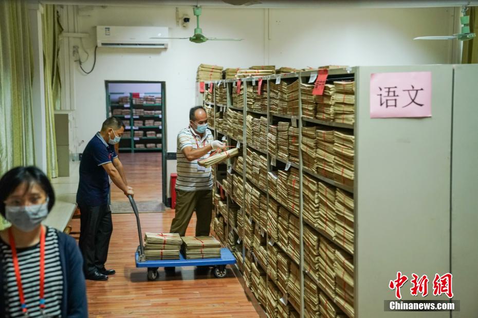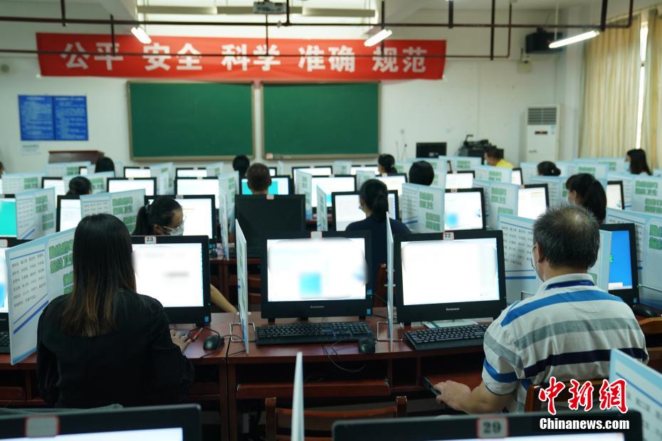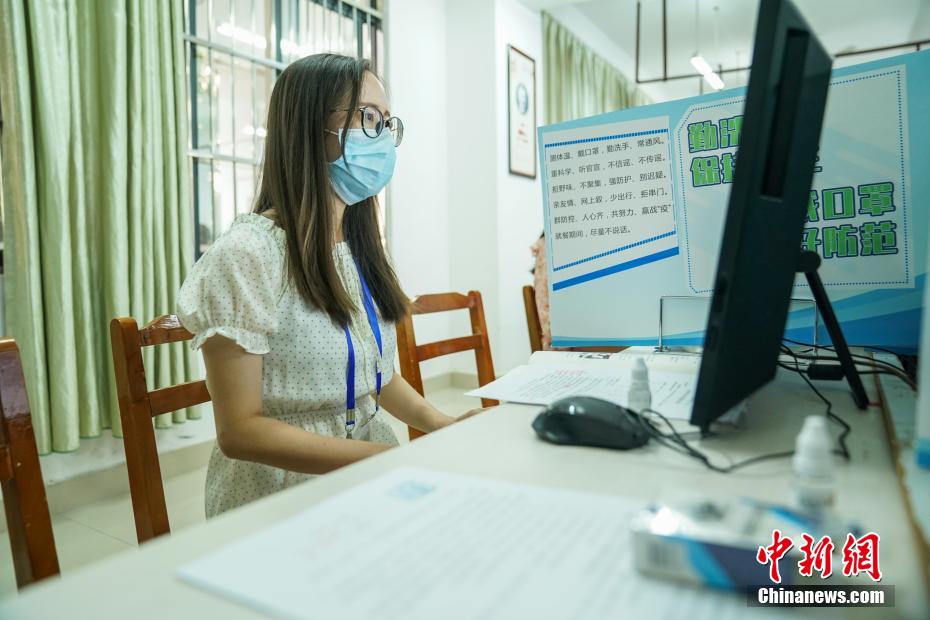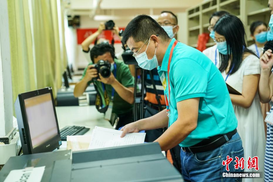 7月16日,广西招生考试院举办高考评卷开放日活动,十余家新闻媒体记者受邀探访2020年高考评卷现场。广西招生考试院相关负责人介绍,今年广西高考统考考生近37.9万人,答题卡共近152万张,比去年增加8万余张。今年广西共选聘了3000余名评卷教师及评卷工作人员,所有评卷人员须持有健康绿码,且连续14天身体健康监测正常方可参与评卷工作,到评卷点后还需采取住校、间隔评卷、错峰用餐等防疫措施。图为相关人员进场前接受安检。 陈冠言 摄