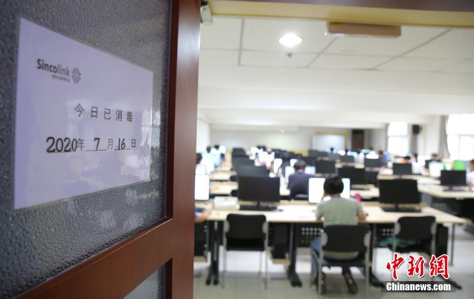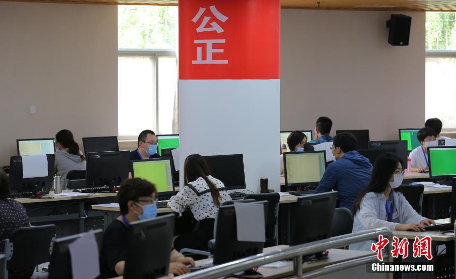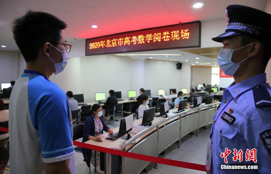7月16日,相关人员在进入位于北京清华大学的高考数学评卷点前存放通讯等电子器材、接受安防和体温检测等。今年北京高考共需评卷约35万份。根据工作安排,评卷工作已从7月9日开始,预计将于24日结束,25日12时发布考生高考成绩,并公布高考本科批次录取最低分数线。 中新社记者 杨可佳 摄