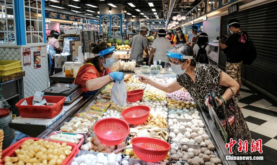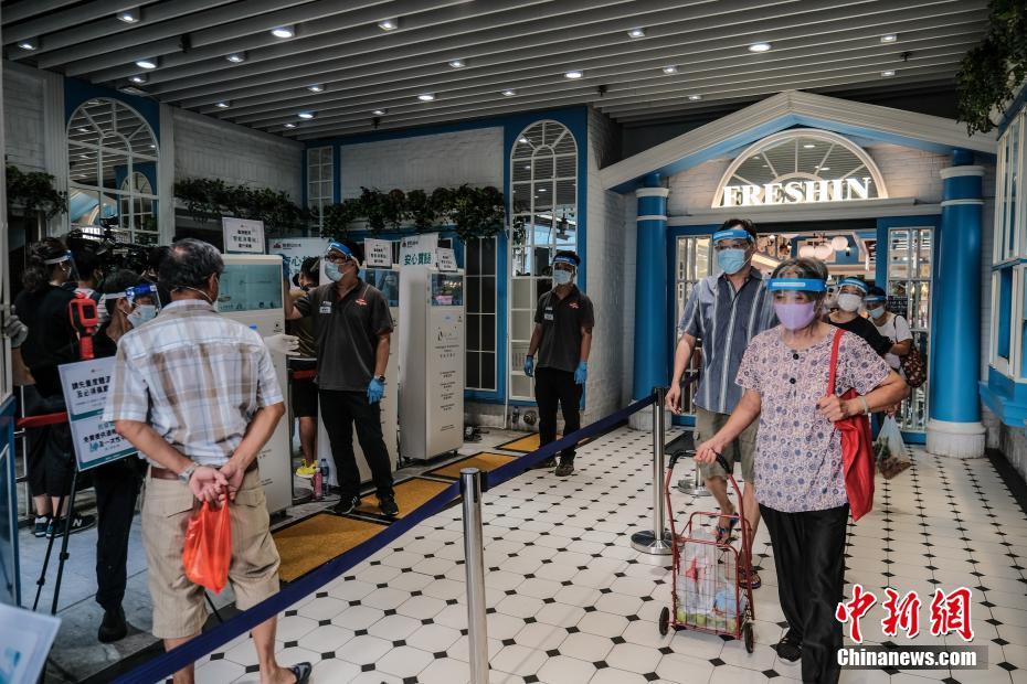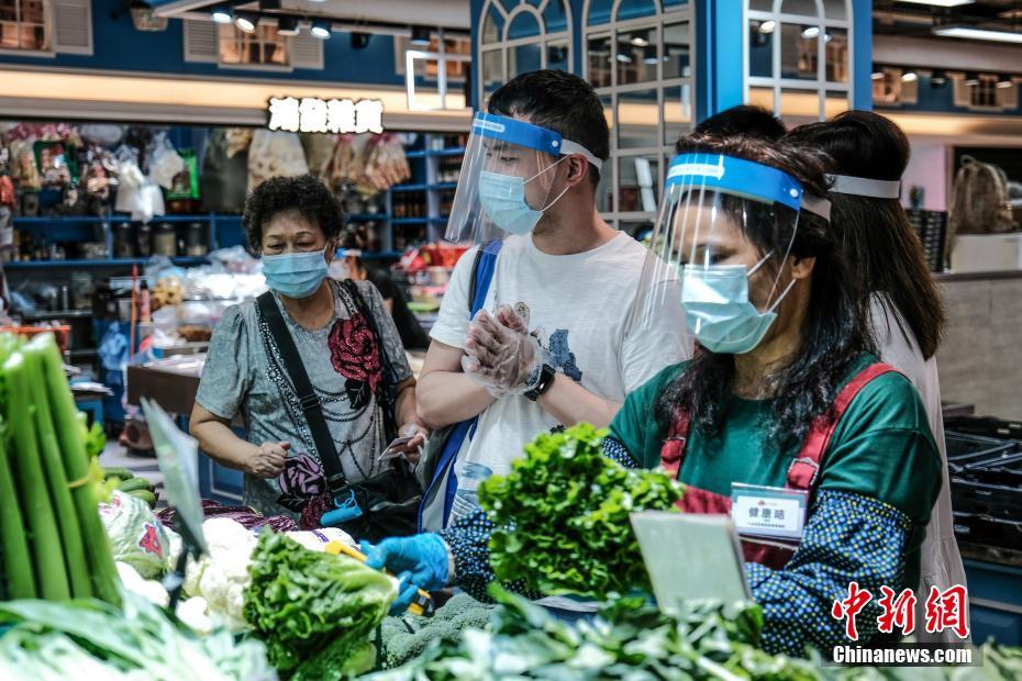 早前香港多宗新冠肺炎确诊个案与慈云山街市有关。7月29日,慈云山街市推行多项措施加强防疫,市民进入街市前必须量度体温及戴上口罩、并于街市入口的智能消毒站接受喷雾消毒,街市内的商户以及大部份进入街市的市民均有戴上面罩。 中新社记者 秦楼月 摄