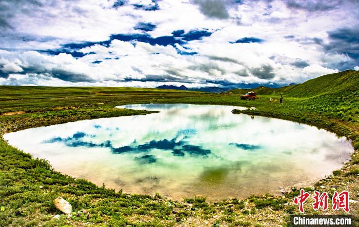 蔚蓝的天空、紫色的山花花海、如同眼睛一般的“眼睛湖”交织在一起,风景如画。
